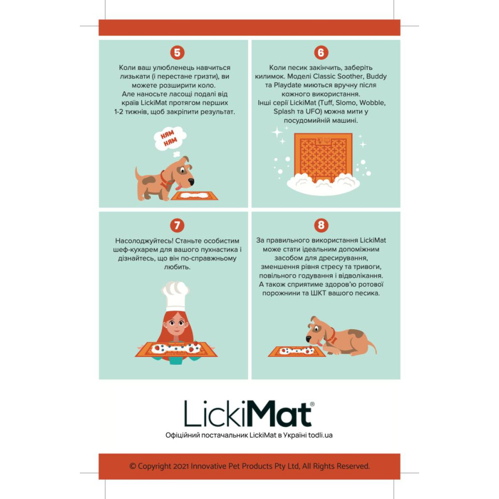 Рекомендується наглядати за улюбленцем перші кілька разів використання, щоб переконатися, що він не намагається гризти килимок. Моделі серії Tuff є більш міцними, але не є іграшкою для жування.