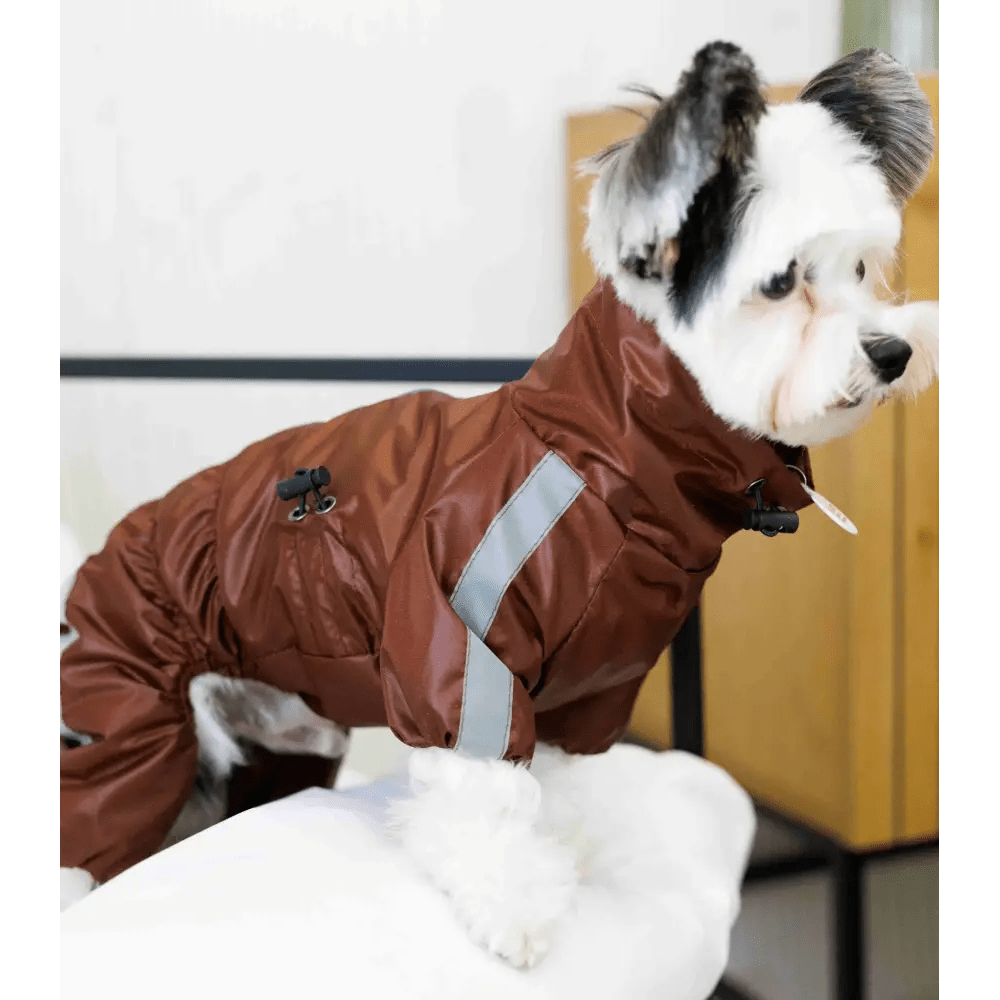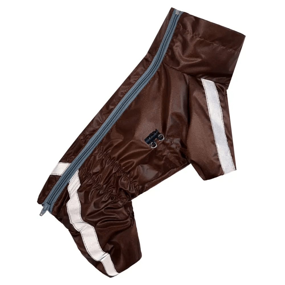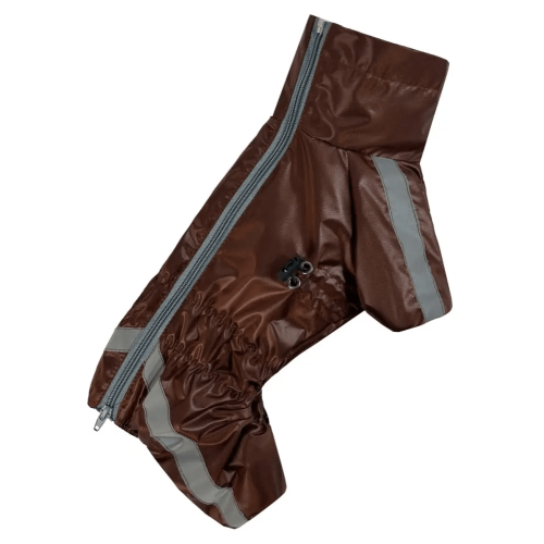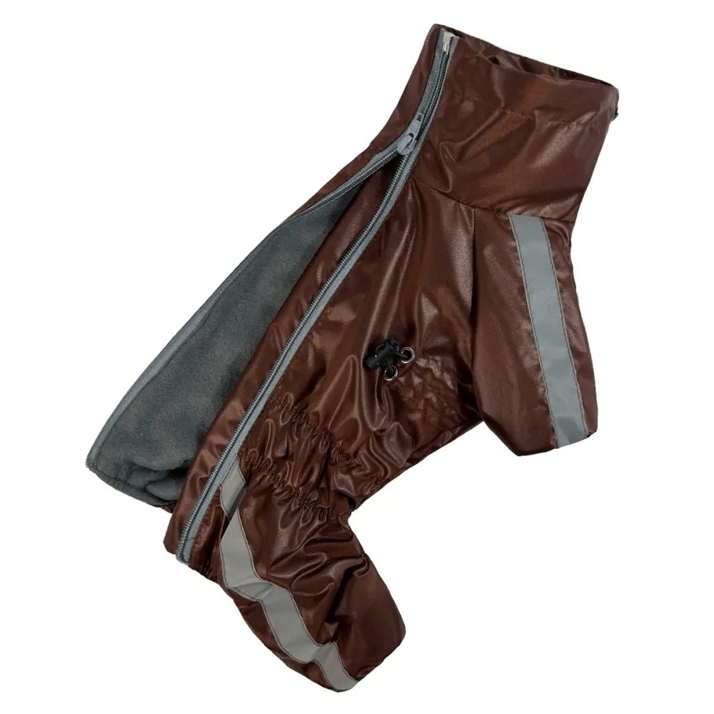 Утеплений дощовик для собак Dogs Bomba MF-34 виготовлений з практичної водовідштовхувальної плащівки та м'якого флісу. Модель коричневого кольору надійно захищає шерсть улюбленця від бруду та вологи, а утеплювач забезпечує комфортну температуру тіла. Завдяки застібці-блискавці на спині процес зборів на вулицю займає мінімум часу. Виріб має резинки на штанинах для фіксації та запобігання потраплянню води всередину. Відмінний варіант для прохолодної весни або дощової осені. Взимку рекомендуємо використовувати як додатковий шар під зимовий одяг для собак.