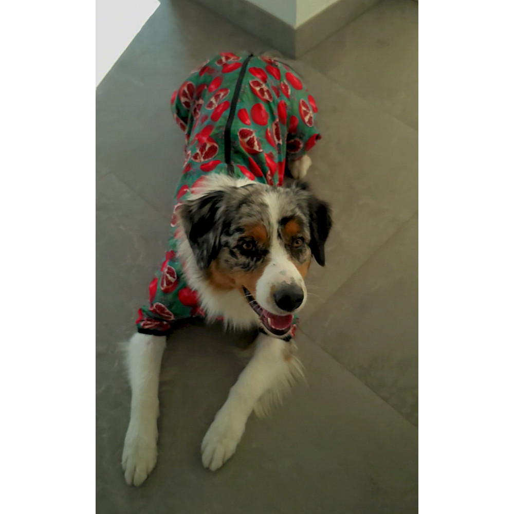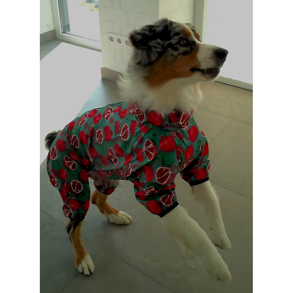 Елегантний малюнок "Гранати" додає виробу яскравості та індивідуальності, виділяючи вашого собаку на прогулянці. Завдяки блискавці на спині, яка застібається зверху донизу, дощовик легко одягати та знімати. М'яка, але міцна тканина дозволяє собаці вільно рухатися, не обмежуючи його активність.