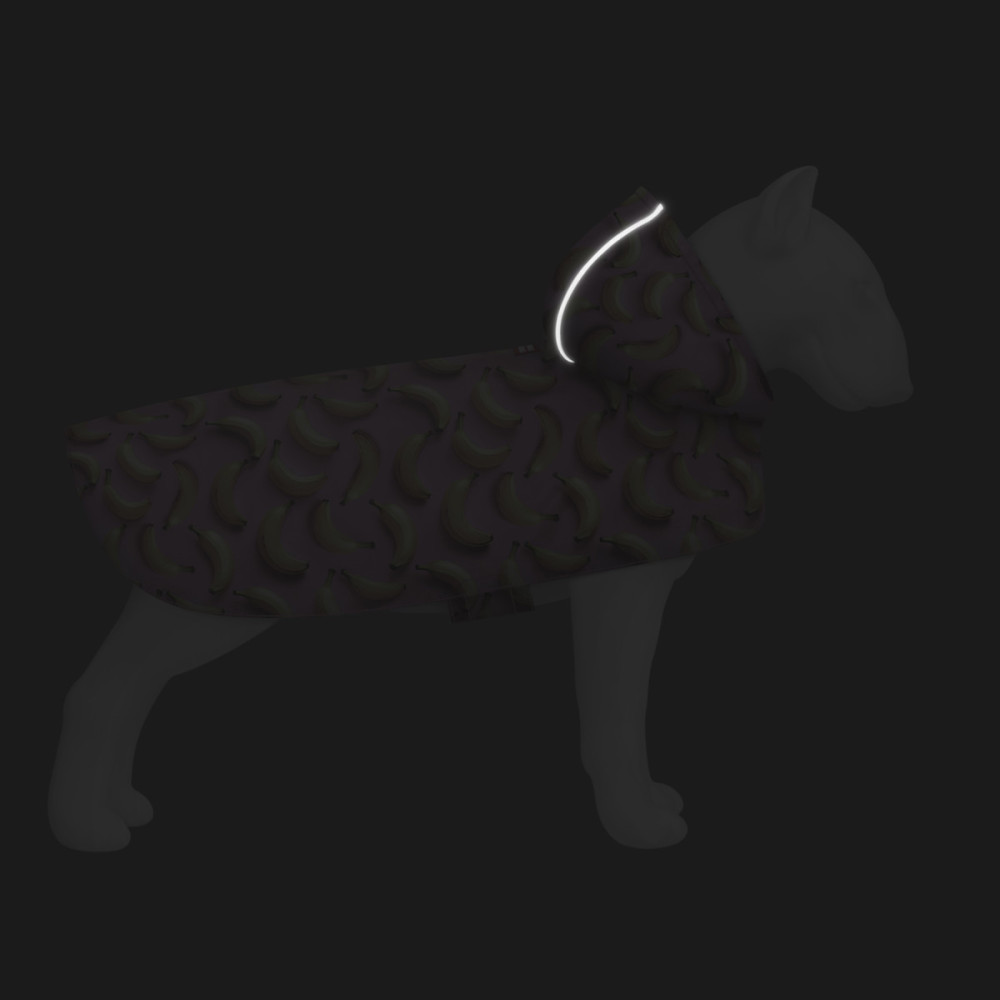 Капюшон захищає голову собаки, а світловідбивні елементи підвищують безпеку на прогулянках у сутінках. Застібки-липучки дозволяють легко та швидко одягати дощовик. Принт «Банани на рожевому» додає веселого настрою і привертає увагу до вашого хвостатика.