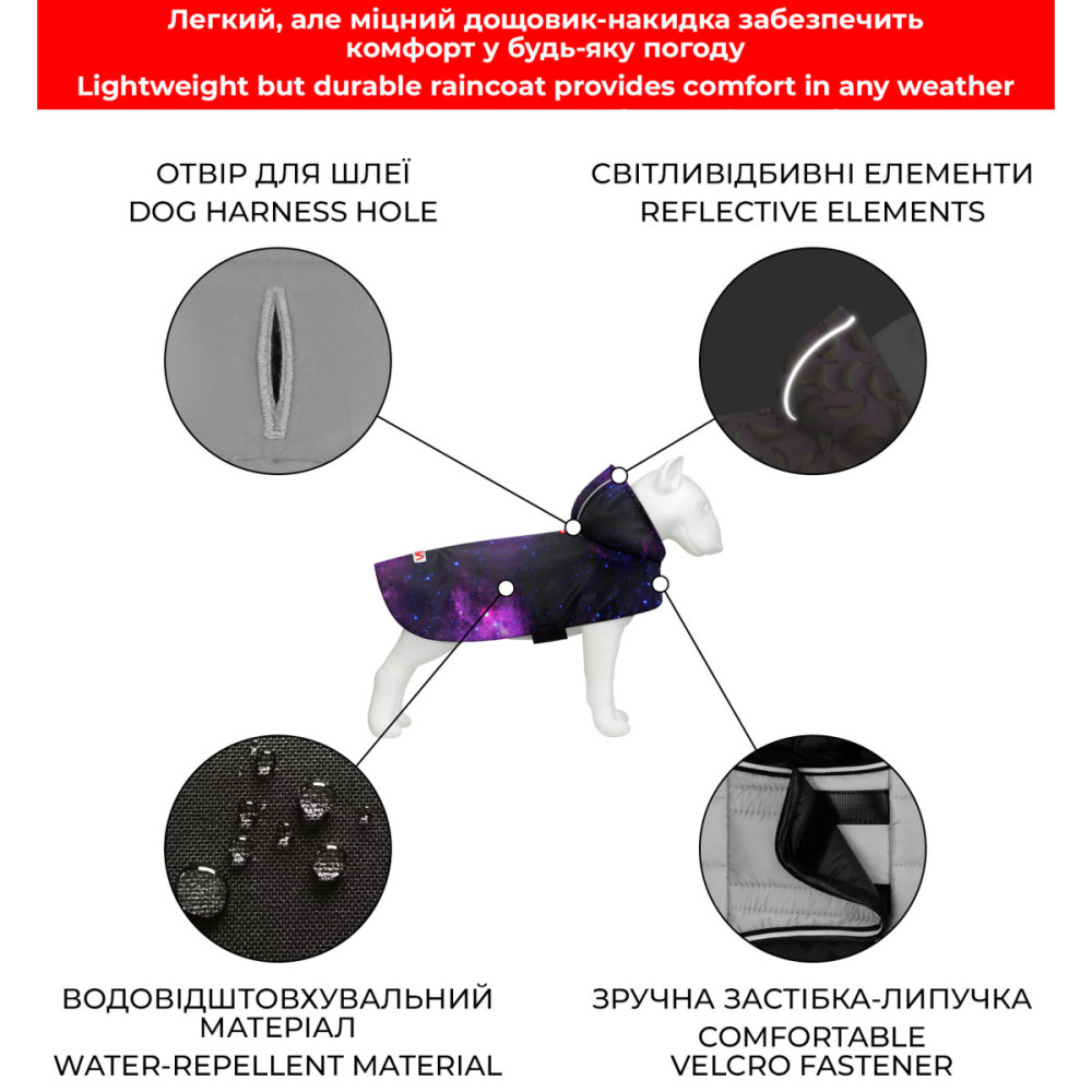 Модель оснащена зручним капюшоном і застібками-липучками, що дозволяють швидко одягати і знімати дощовик. Світловідбивні елементи покращують видимість собаки в темний час доби, підвищуючи безпеку на прогулянках. Яскравий космічний принт «NASA21» додає образу унікальності та сучасного стилю.