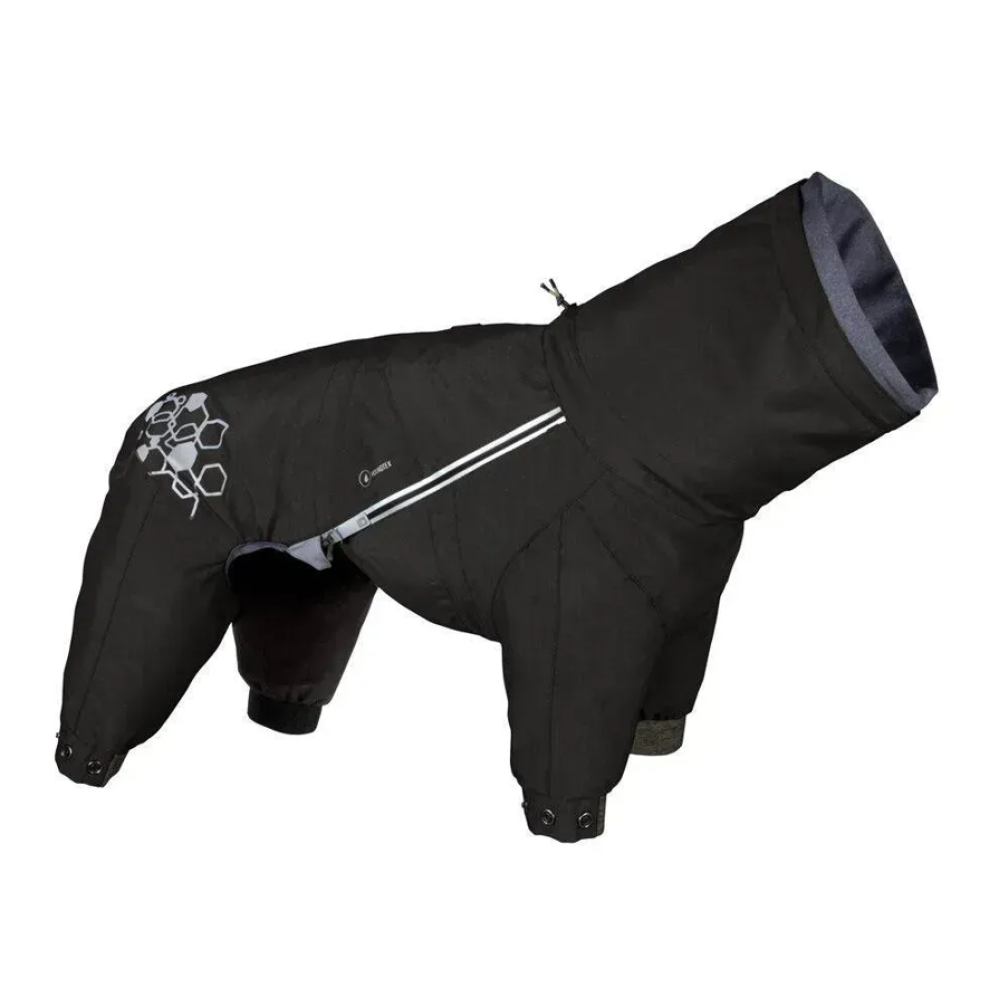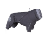 Hurtta Mudventure Overall ECO — чорний дощовик-комбінезон для собак із повним прикриттям корпусу та лап. Легка безпідкладкова конструкція захищає від дощу, бруду й вітру: водонепроникність понад 10 000 мм, повністю проклеєні шви і внутрішній водонепроникний комір Rainstopper, що щільно прилягає за вухами та блокує потрапляння води. Широкий вітрозахисний клапан герметизує блискавку, а верхній закривний отвір для шлейки/повідка не дає воді затікати всередину. Тиха еластична тканина не шарудить і не плутає шерсть, комбінезон швидко складається у рюкзак.