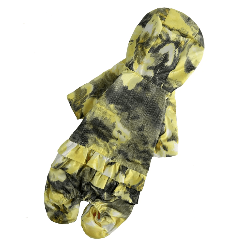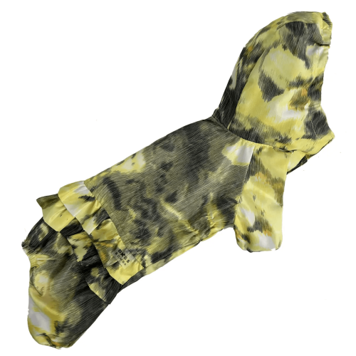 Завдяки використанню водовідштовхувальної плащівки як основного матеріалу, так і в якості підкладки, цей дощовик для собак гарантує сухість навіть під час інтенсивних опадів. Дизайн з рюшами додає оригінальності, а продумана конструкція забезпечує комфортну посадку без сковування рухів.