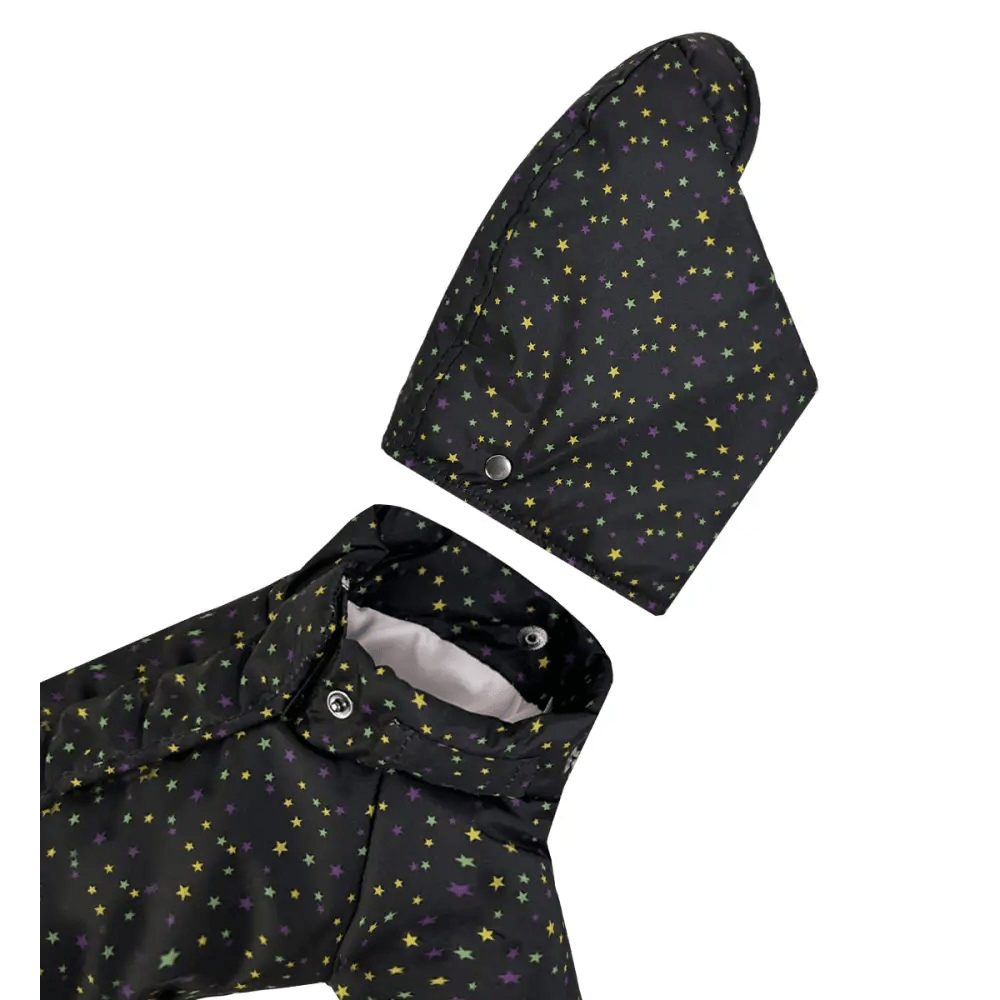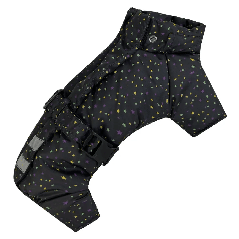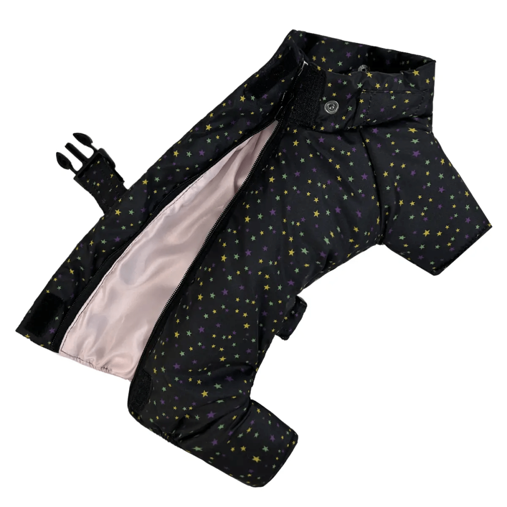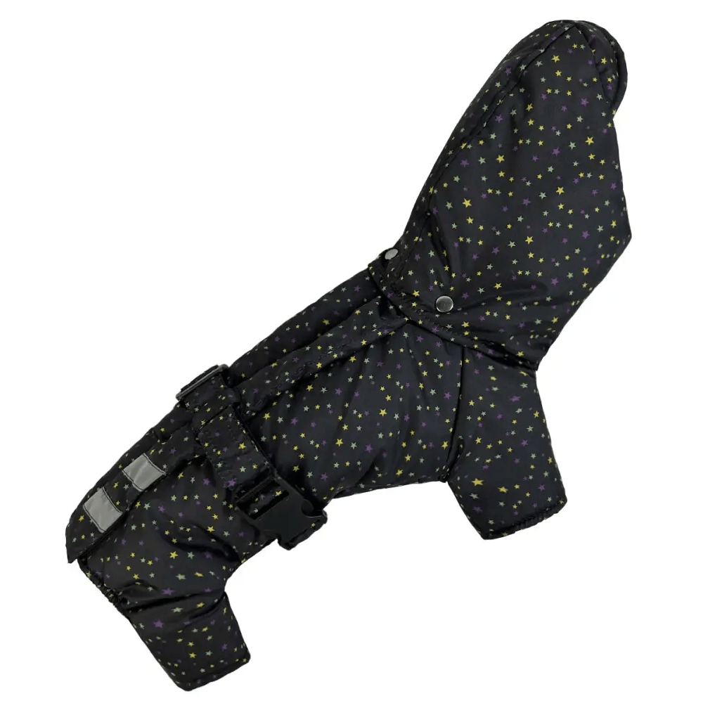 Зимовий комбінезон для собак R-45 з принтом "чорні зірки" – це стильний вибір для холодної пори року. Виготовлений із водовідштовхувальної плащівки, комбінезон надійно захищає від вологи, а синтепоновий наповнювач забезпечує тепло навіть у морозні дні. Підкладка з водовідштовхувальної тканини додатково захищає від негоди.