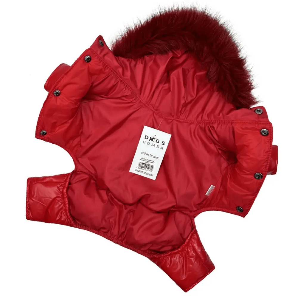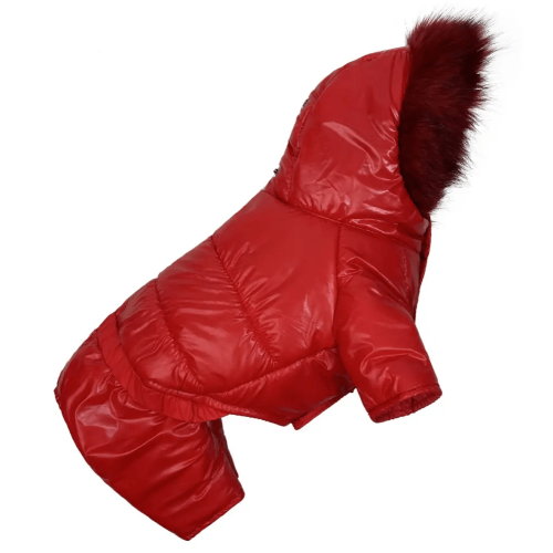 Зимовий комбінезон для собак Dogs Bomba A-77 виготовлений з червоної лакованої плащівки, яка має водовідштовхувальні властивості. Модель утеплена синтепоновим наповнювачем та оснащена м'якою нейлоновою підкладкою, що забезпечує комфорт під час прогулянок. Виріб має капюшон зі штучним хутром, який фіксується кнопкою, та еластичні манжети на лапах для запобігання потраплянню холодного повітря. Цей зимовий одяг для собак розрахований на температуру до -10°C.