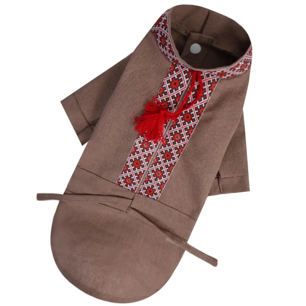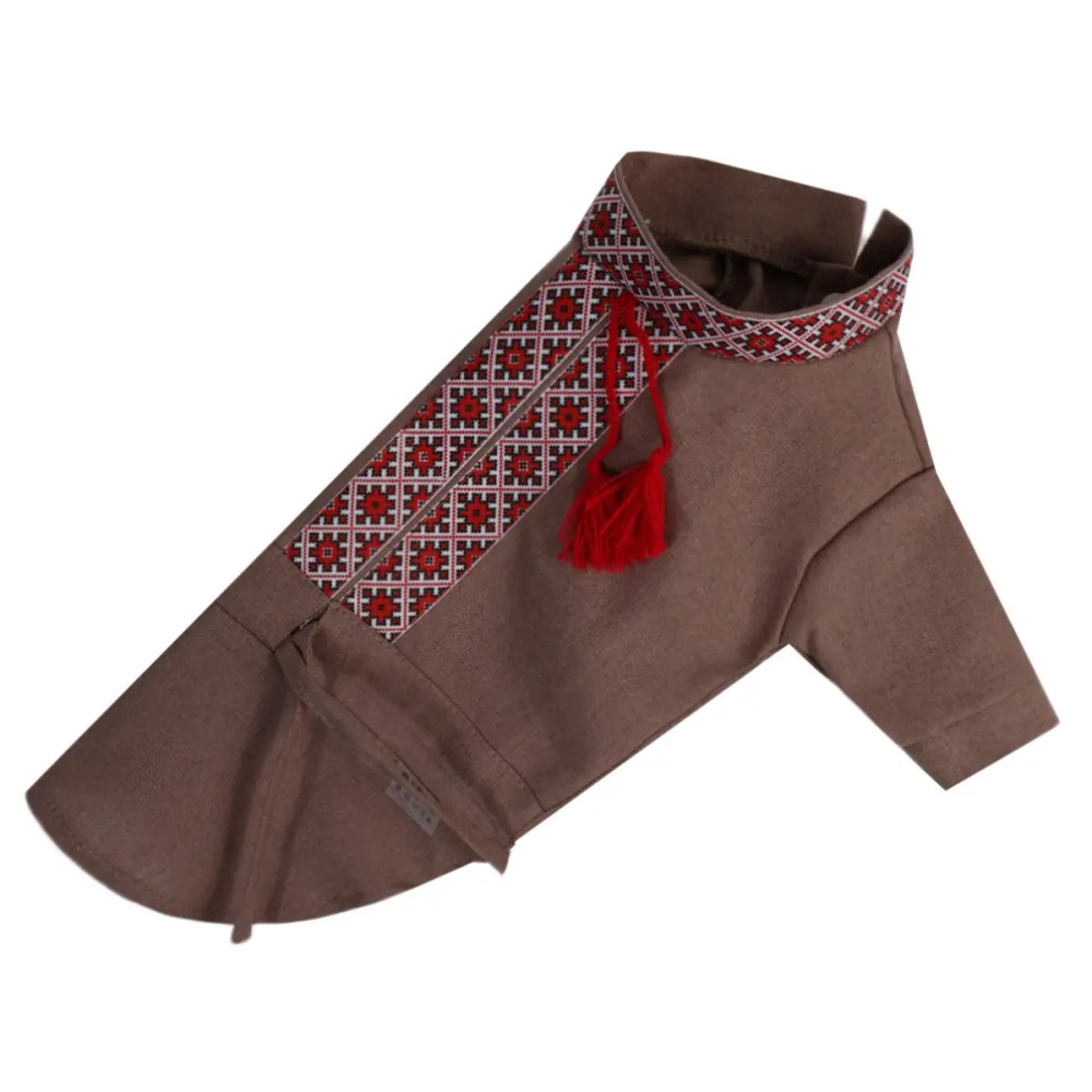 Вишиванка для собак з китицями RY-59 коричневого кольору — стильний та автентичний одяг для вашого чотирилапого друга, що поєднує традиційний український дизайн і сучасний комфорт. Виготовлена з натуральної лляної тканини, яка забезпечує чудову циркуляцію повітря і дозволяє вашому улюбленцю почуватися комфортно навіть у спеку.