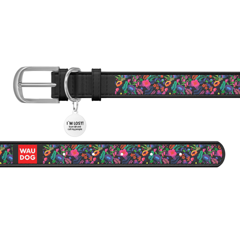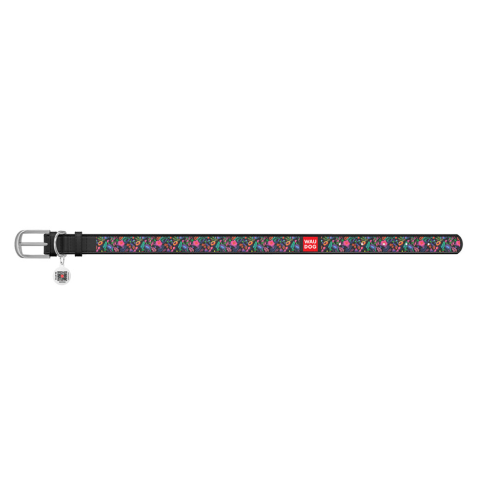 Шкіряний чорний нашийник для собак WAUDOG Design з малюнком “Чарівні квіти” та металевою пряжкою – це ідеальний вибір для собак будь-яких порід.