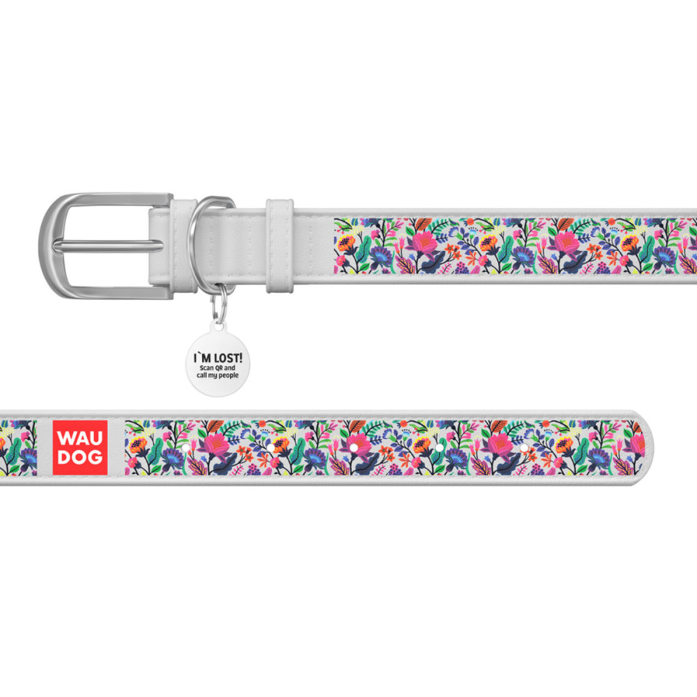 Шкіряний білий нашийник для собак WAUDOG Design з малюнком “Чарівні квіти” та металевою пряжкою – це ідеальний вибір для собак будь-яких порід.