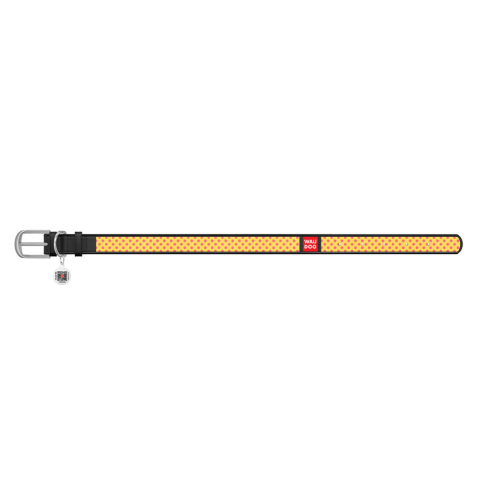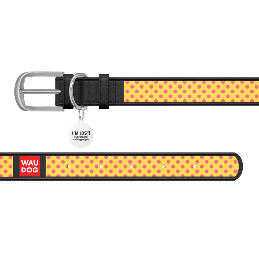 Шкіряний чорний нашийник для собак WAUDOG Design з малюнком “Жовта полька” та металевою пряжкою – це ідеальний вибір для собак будь-яких порід.