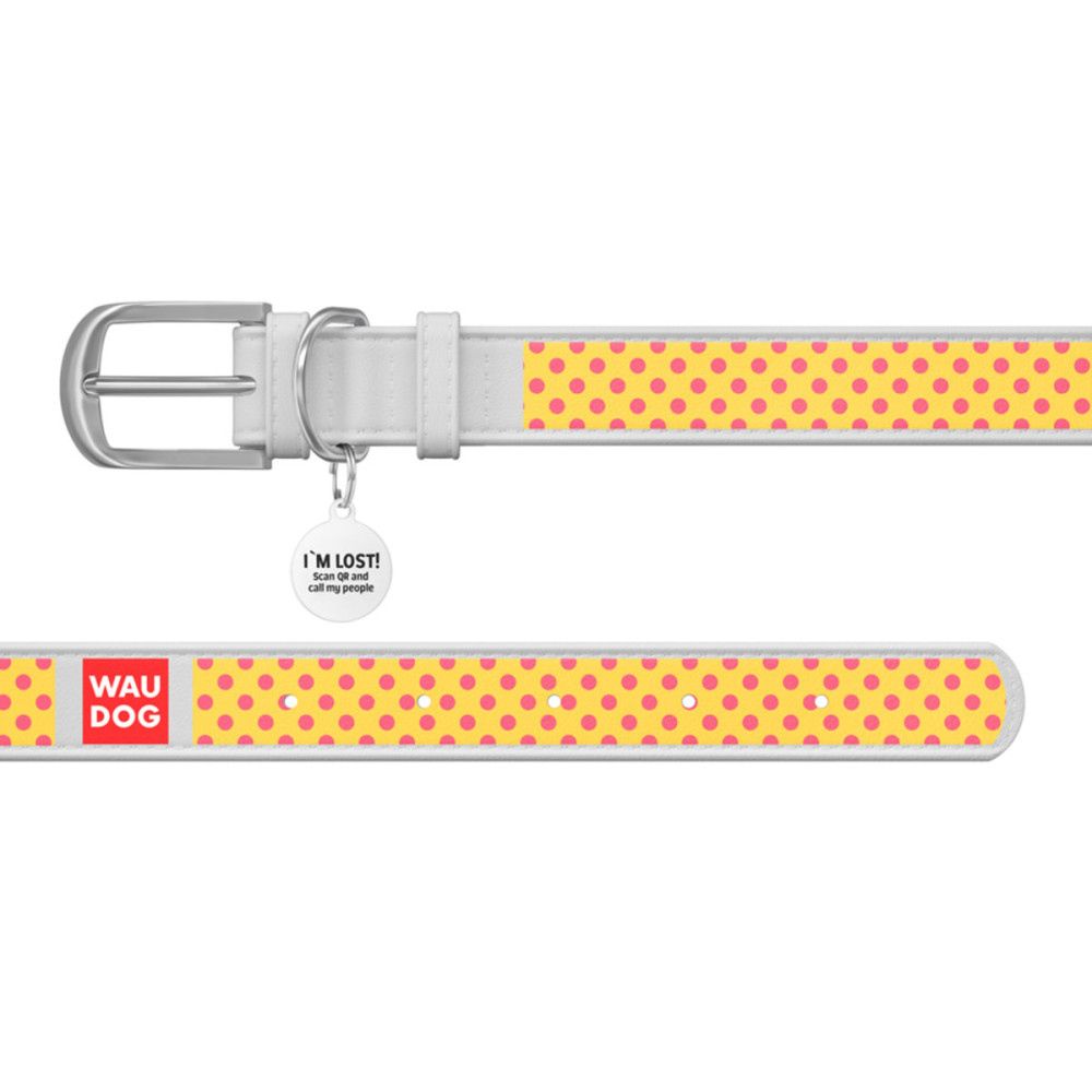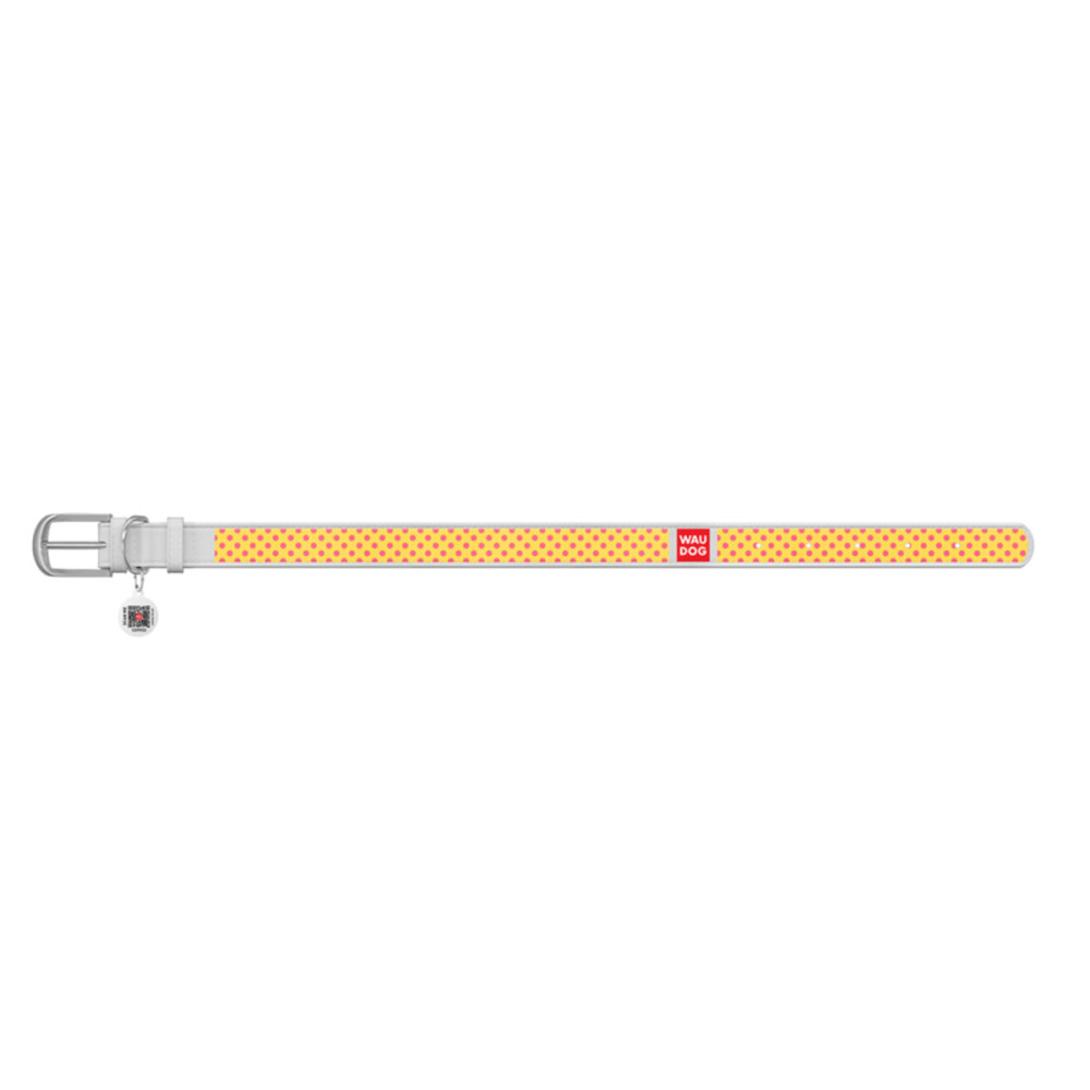 Нашийник WAUDOG Design з малюнком “Жовта полька”, біла преміум шкіра, металева пряжка