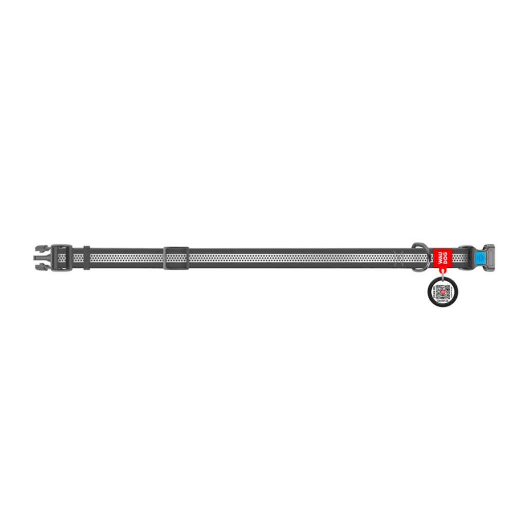 Якісний водостійкий нашийник сірого кольору з пряжкою-фастексом із замком, "розумним" адресником з QR паспортом та світловідбиваючою смугою, яка підвищує помітність собаки у темну пору доби.