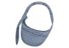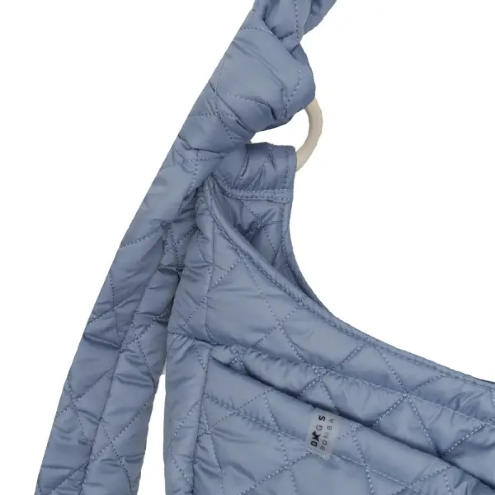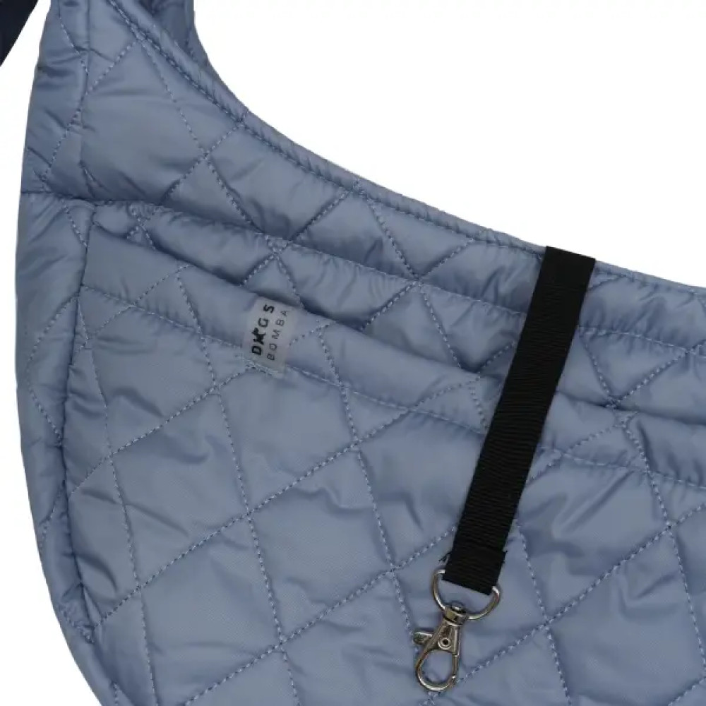 S-116 — стёганый голубой слинг-переноска для собак на каждый день. Снаружи — водоотталкивающая плащёвка, внутри — страхующий ремешок для крепления к ошейнику или шлейке. Регулируемая лямка позволяет носить через плечо с нужной длиной, а карман на кнопке держит вкусняшки, пакеты или ключи.