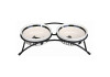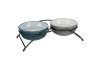 Ключевая особенность этого набора — металлическая подставка с порошковым покрытием, которая поднимает миски на удобную для собаки высоту. Это не только улучшает осанку во время еды, но и предотвращает скольжение и переворачивание мисок благодаря нескользящим резиновым ножкам. Тяжелые керамические миски надежно фиксируются в держателе.