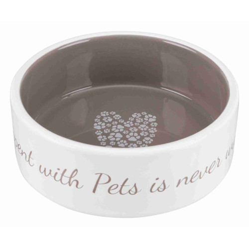 Миска украшена милым принтом в виде сердца и надписью, что добавляет уюта в зону кормления вашего питомца. Благодаря значительному весу керамика обеспечивает устойчивость, предотвращая опрокидывание и скольжение по полу во время еды.