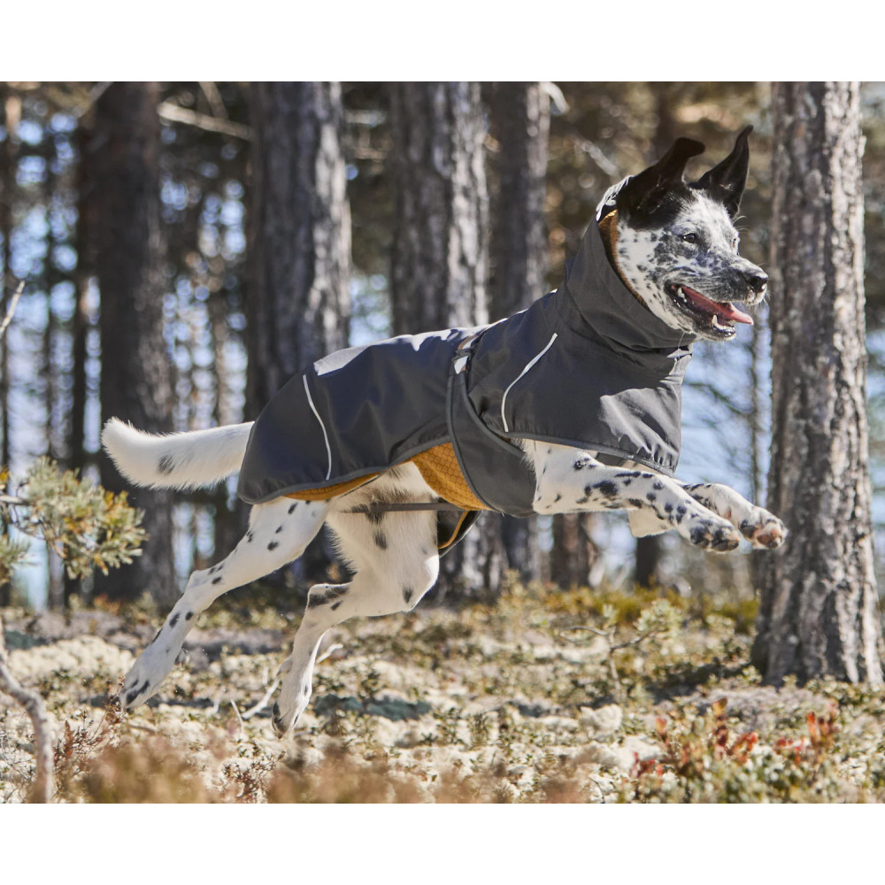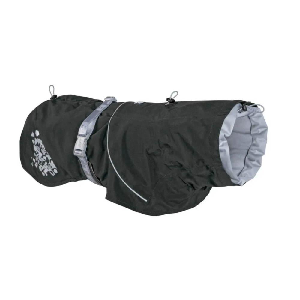 Hurtta Monsoon Coat — серый дождевик для собак на каждый день в дождь, ветер и грязь. Ткань держит 10 000 мм водяного столба, все швы полностью проклеены. Мягкий внутренний воротник Rainstopper плотно закрывает шею и предотвращает попадание воды внутрь, а отверстие для поводка застёгивается на кнопку, чтобы вода не стекала по спине.