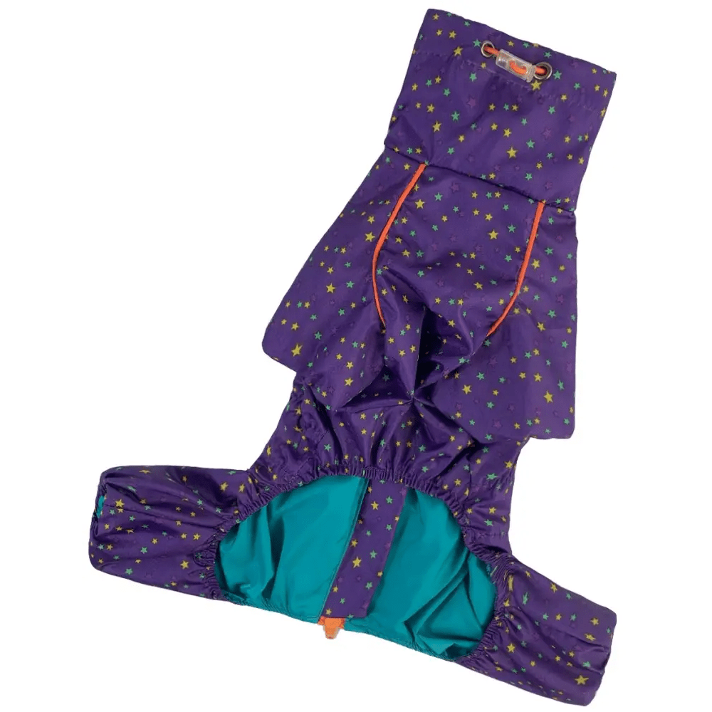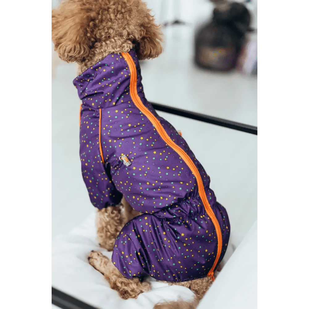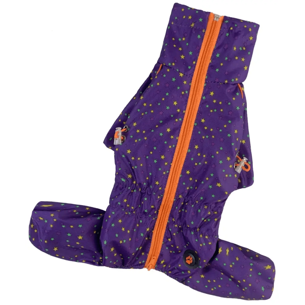 Модель застёгивается на молнию, расположенную на спине, что делает процесс надевания и снятия дождевика максимально быстрым и удобным. Регулируемые утяжки в области шеи и груди позволяют подогнать изделие под индивидуальные параметры собаки, не сковывая её движений. Яркий фиолетовый цвет с принтом «Звёздочки» добавляет стильные акценты, превращая вашего четвероногого друга в модника в любое время года.