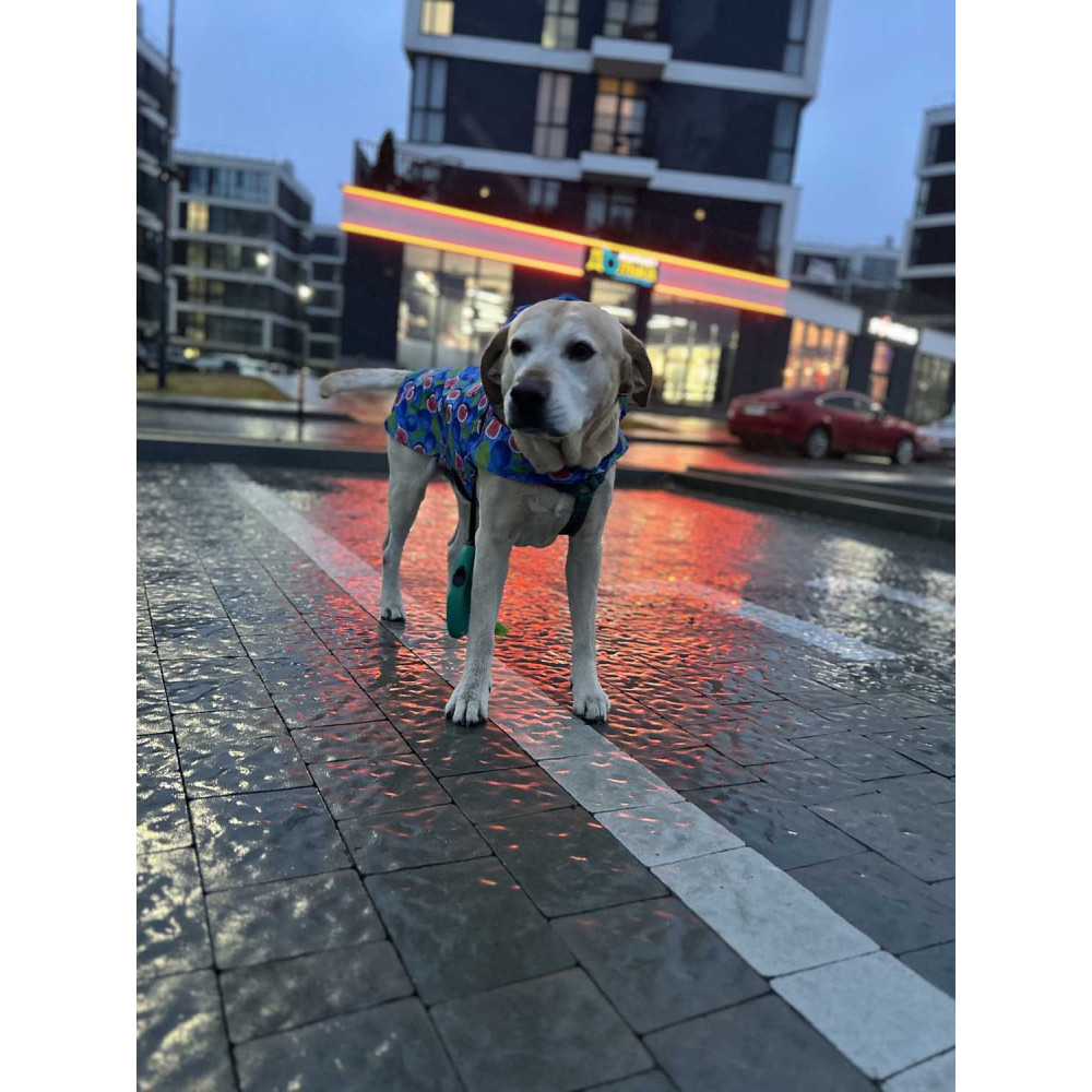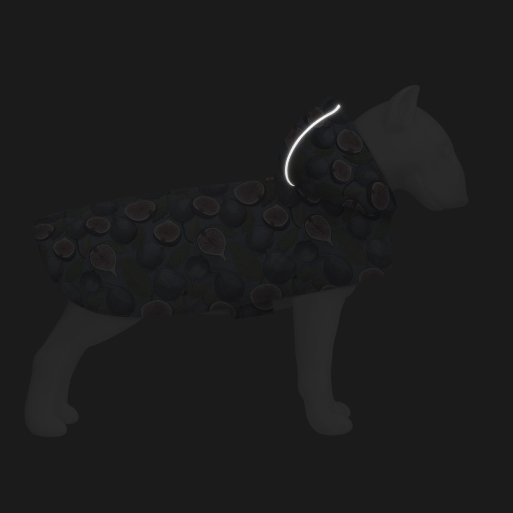 Модель оснащена капюшоном и застёжками-липучками для удобного надевания. Светоотражающие элементы повышают видимость собаки в тёмное время суток, делая прогулки более безопасными. Оригинальный фруктовый принт «Инжир» добавляет яркости и подчёркивает индивидуальность питомца.