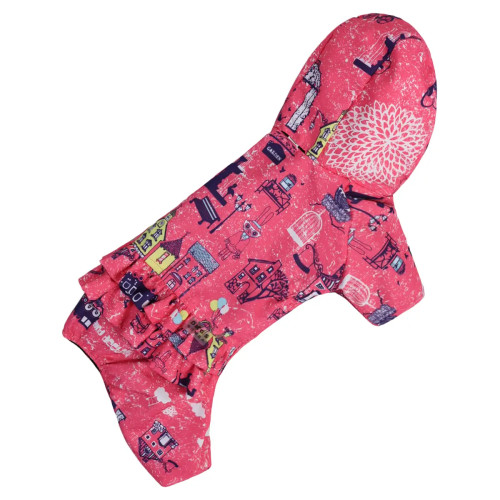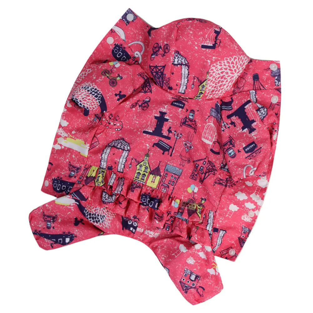 Курточка оснащена капюшоном, застёжкой на кнопках и закрытым животиком. Также предусмотрено отверстие для поводка. Нежная рюша и изысканный принт «Париж» создают элегантный и романтичный образ для прогулок.