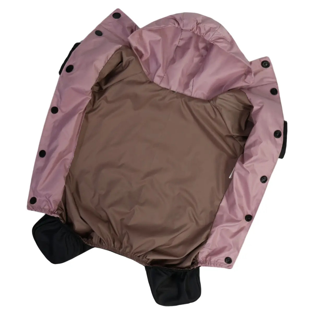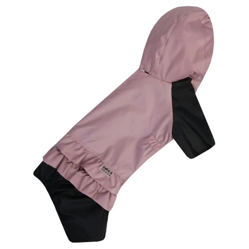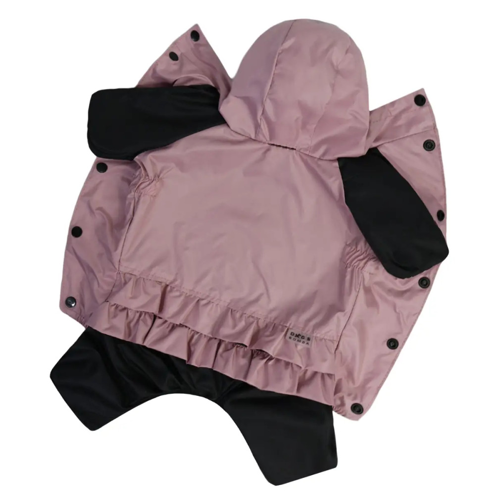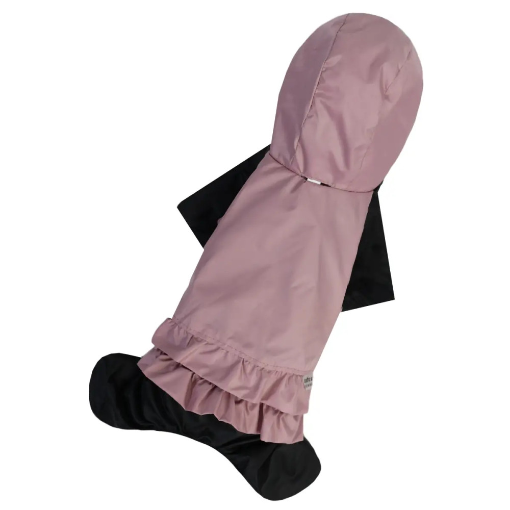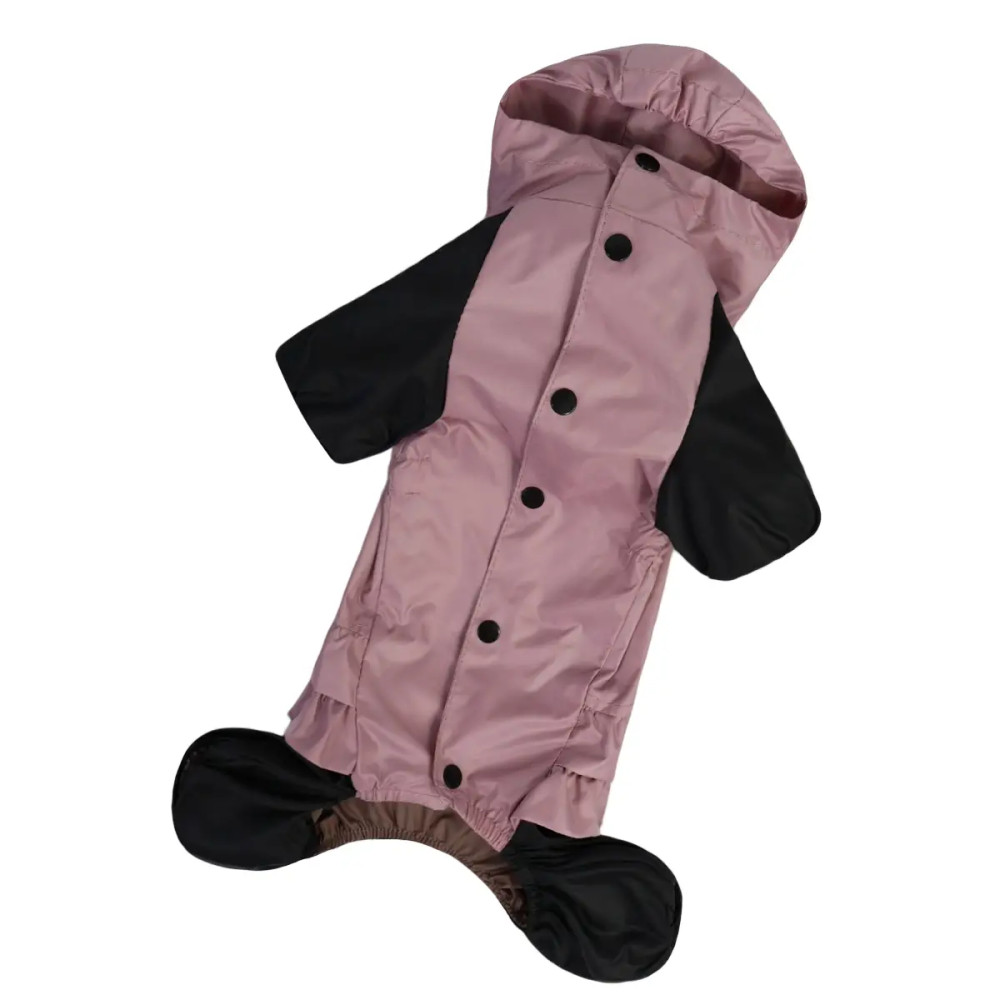 Модель оснащена капюшоном, кнопочной застёжкой и закрытым животиком для лучшей защиты. Есть отверстие для поводка, что делает дождевик совместимым с ошейником или шлейкой. Рюша и розовый цвет придают изделию элегантность и женственный стиль.
