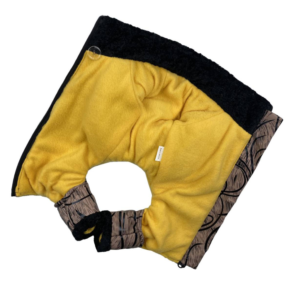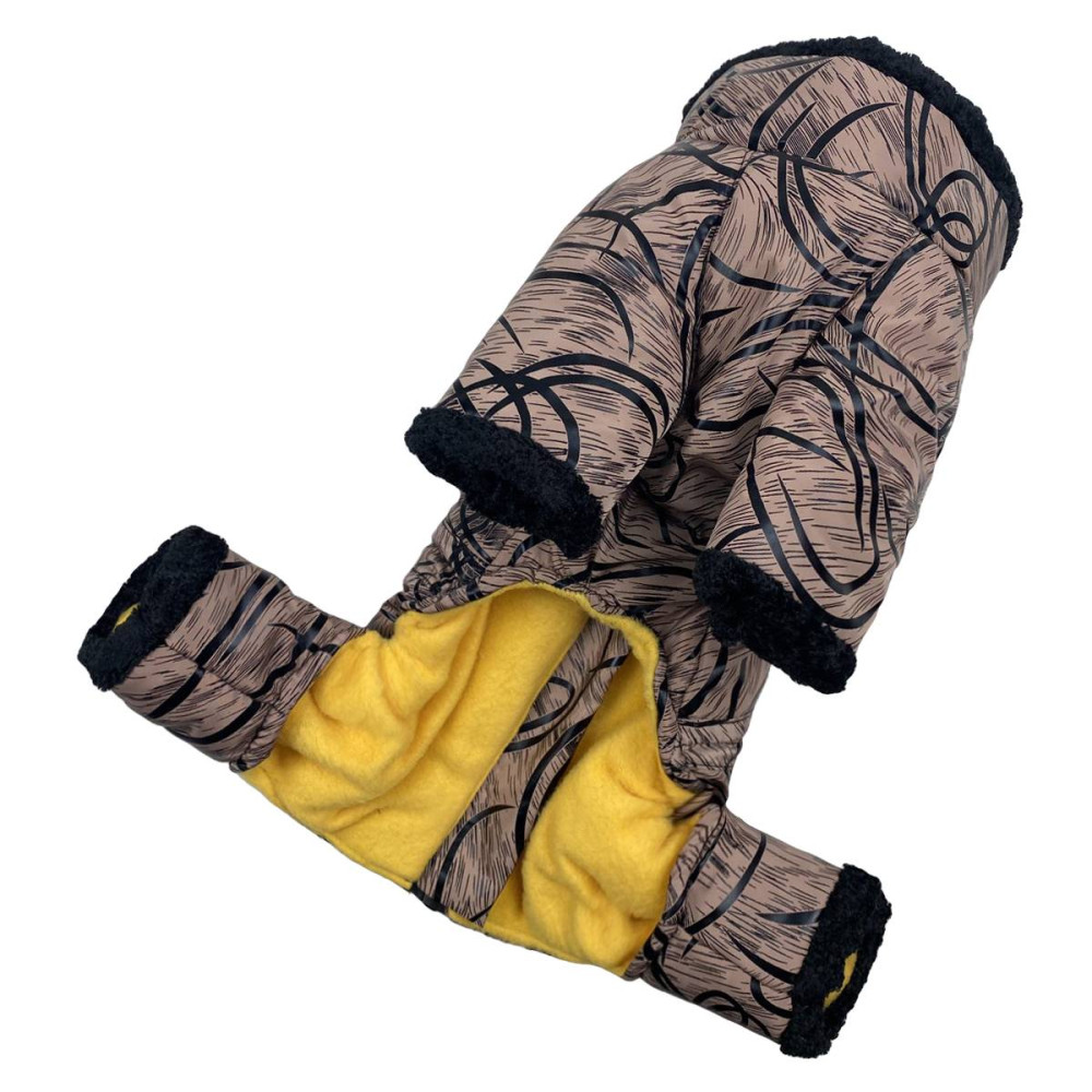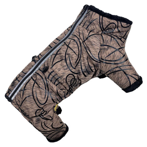 Зимний комбинезон из плащевки коричневого цвета с узорами надежно защитит вашего питомца от холода, влаги и ветра, способных стать причиной простудных заболеваний. Водоотталкивающая ткань не позволяет намокнуть слою синтепонового утеплителя, подкладочного флиса. Черные манжеты из мягкого плюша на горловине и штанинах – не просто декоративные элементы, они служат препятствием для проникновения морозного воздуха под одежду.