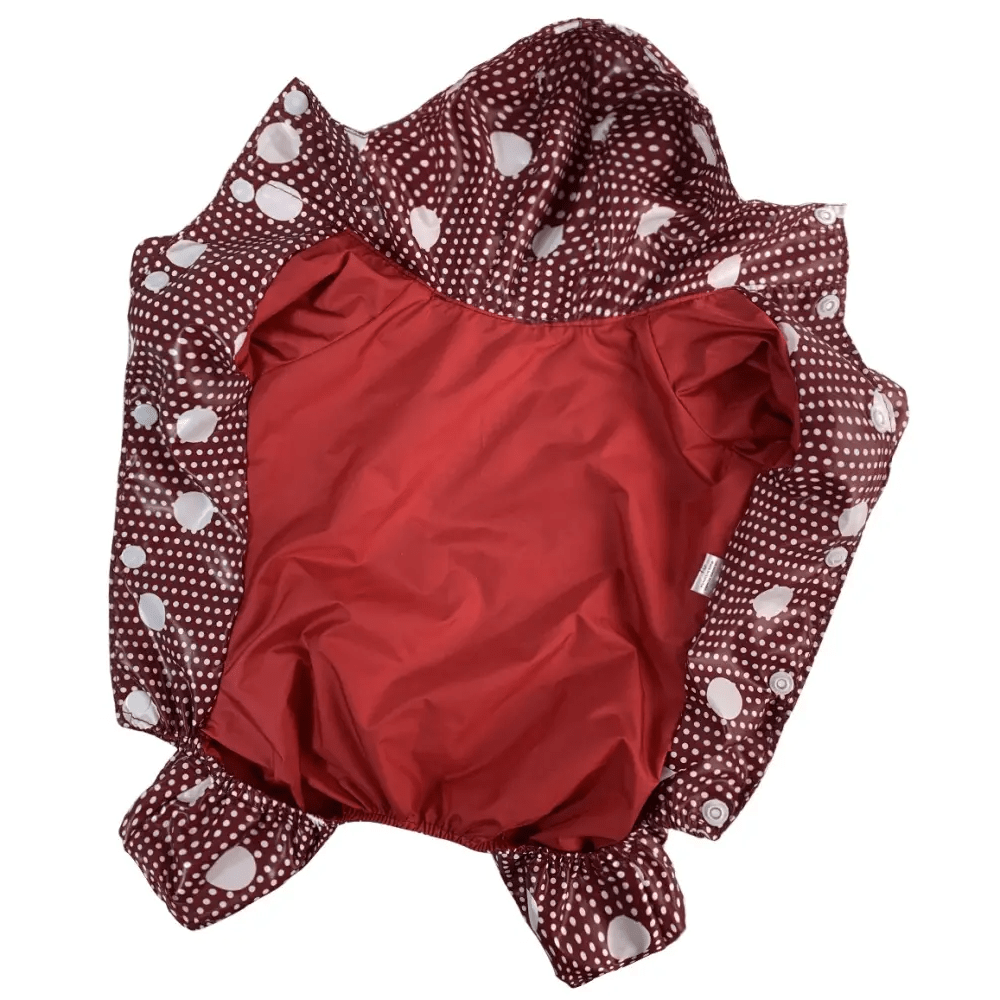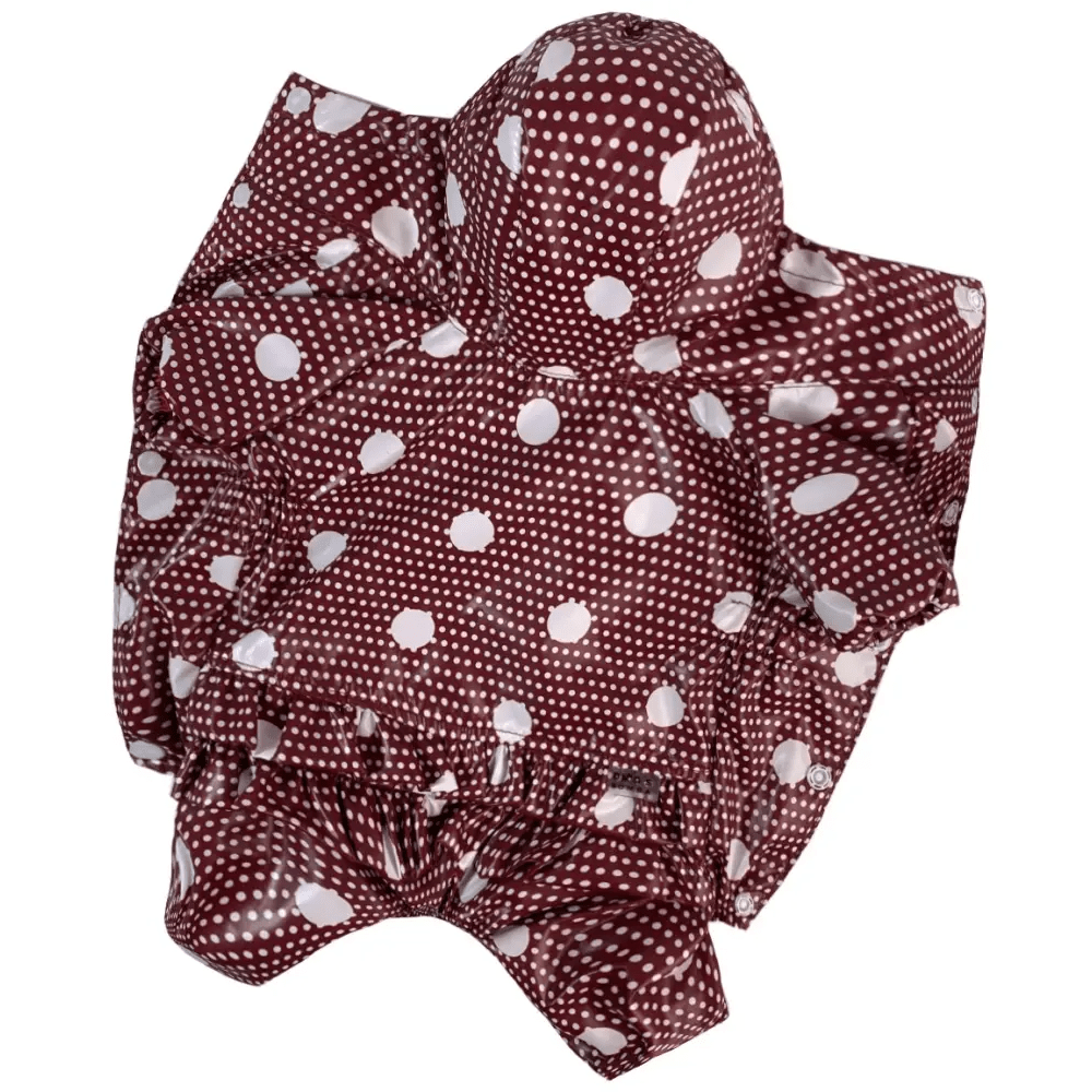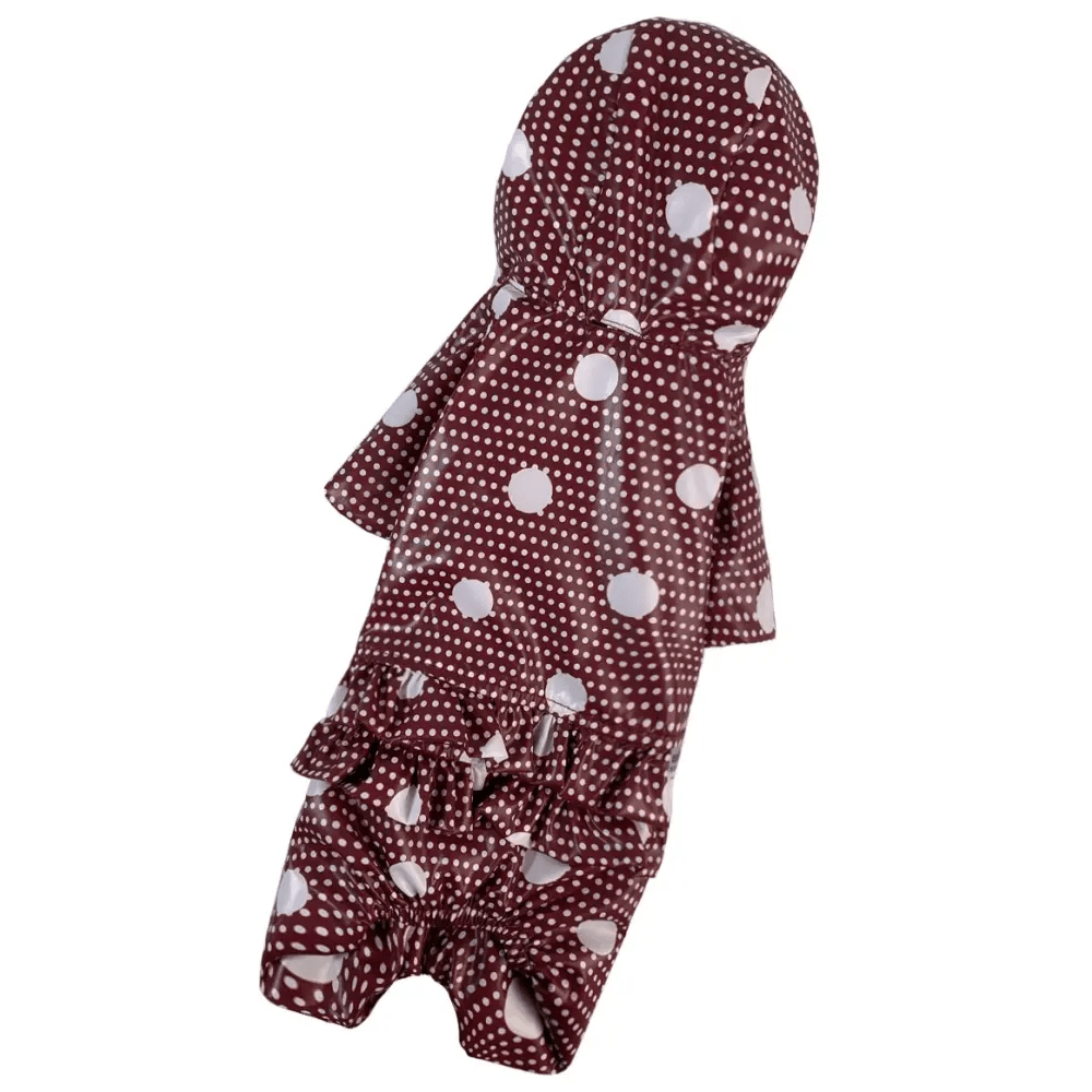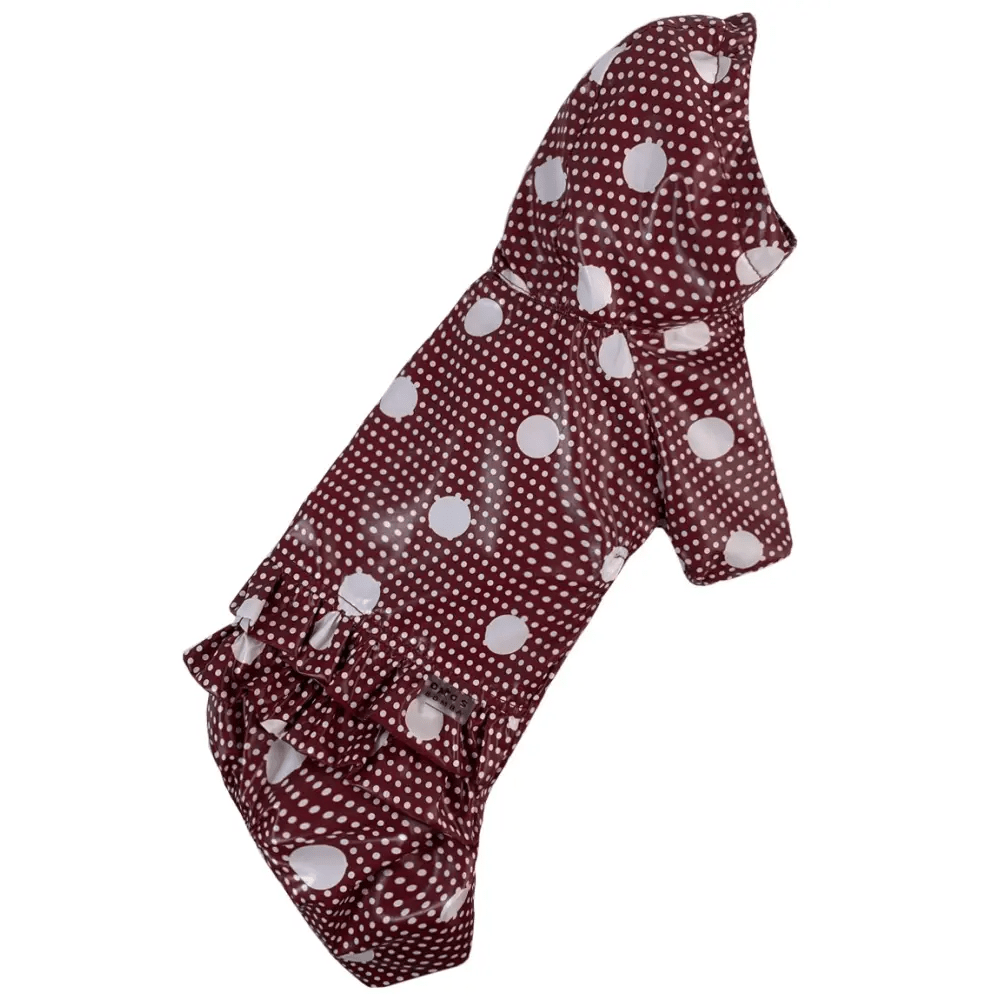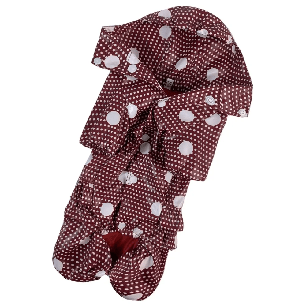 Дождевик для собак Dogs Bomba MD-23 создан с учетом потребностей «девочек», объединяя надежную защиту от влаги и привлекательный внешний вид. Изделие выполнено из бордовой плащевки в горошек с декоративными рюшами. Эта модель отлично вписывается в категорию [одежда для собак мелких пород](https://test.4dog.com.ua/ru/odezhda-dlya-sobak/melkie-porody/) и средних пород, обеспечивая комфорт во время прогулок сырой осенью или весной.