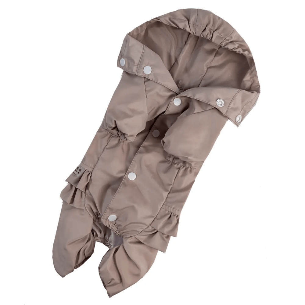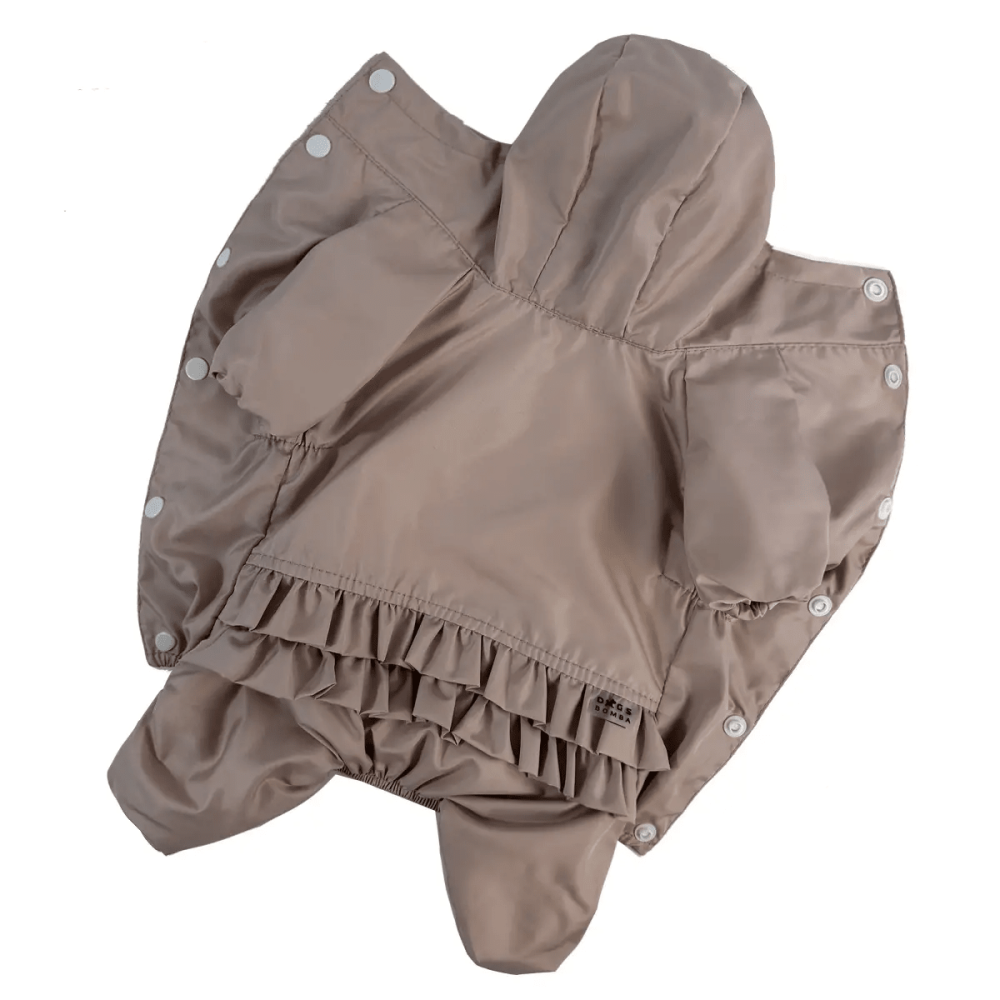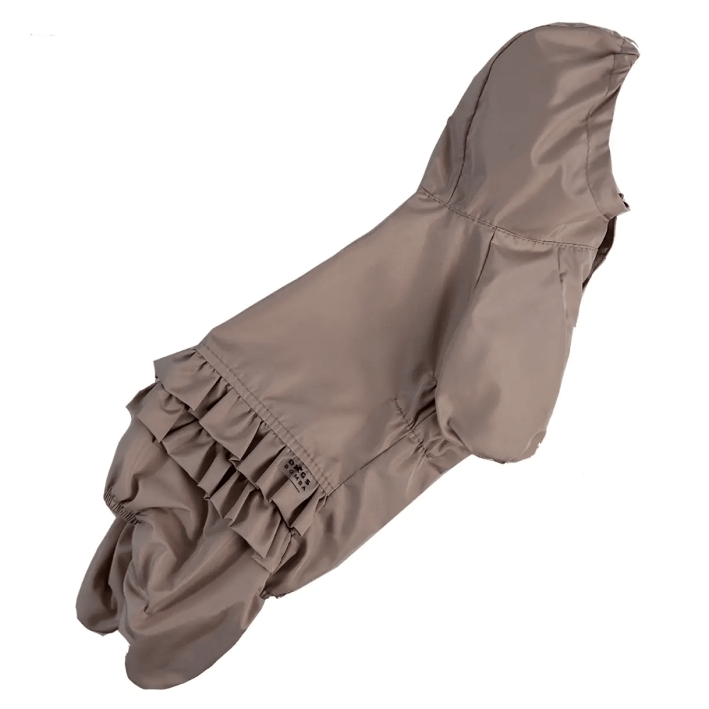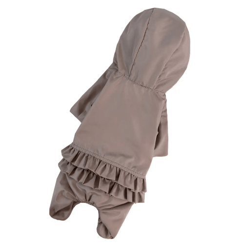 Ключевой особенностью модели является использование водоотталкивающей плащевки не только для внешнего слоя, но и для подкладки. Это создает надежный барьер против воды и грязи, а наличие капюшона позволяет защитить уши и шею собаки от ветра и осадков.