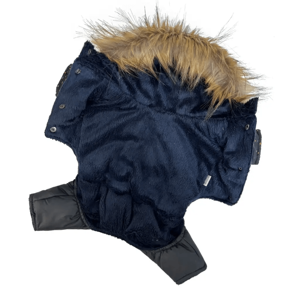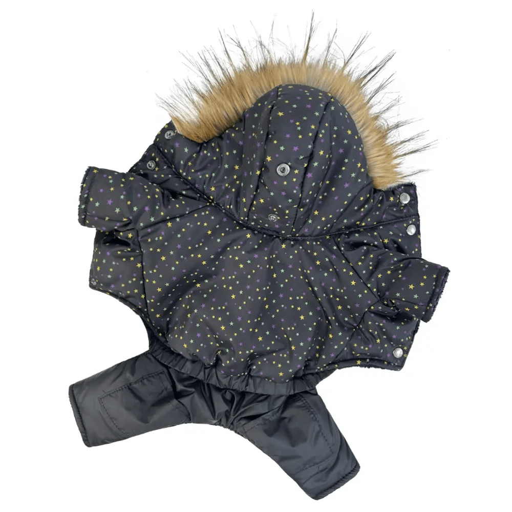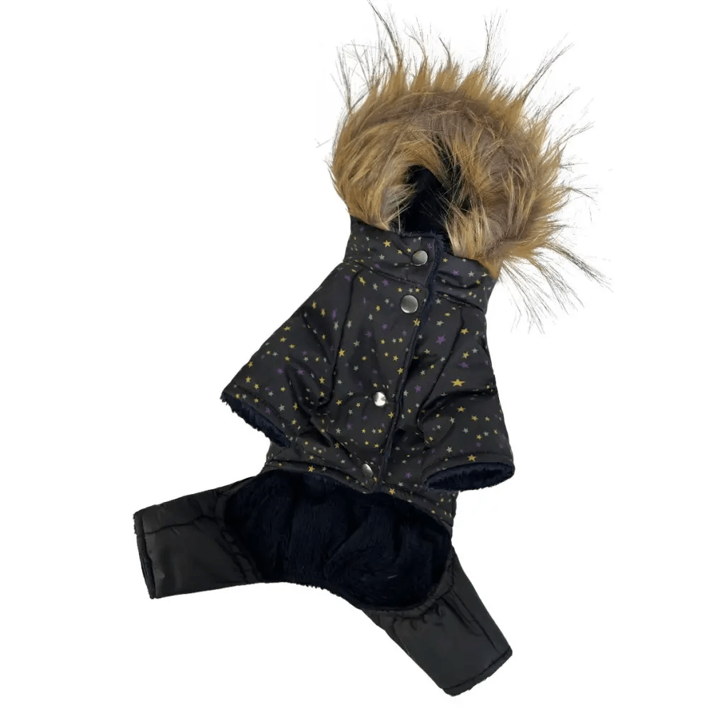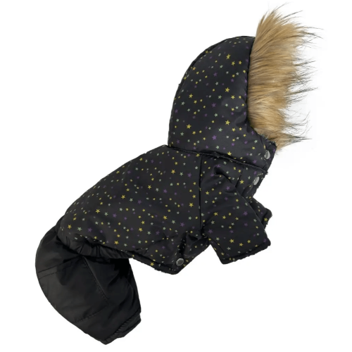 Зимний комбинезон для собак AM-29 чёрного цвета со звёздным принтом – это стильное решение для холодного времени года. Комбинезон выполнен из водоотталкивающей плащевки, которая надёжно защищает от влаги, а синтепоновый наполнитель сохраняет тепло даже в сильные морозы. Мягкая плюшевая подкладка из меха добавляет комфорта и уюта при носке.