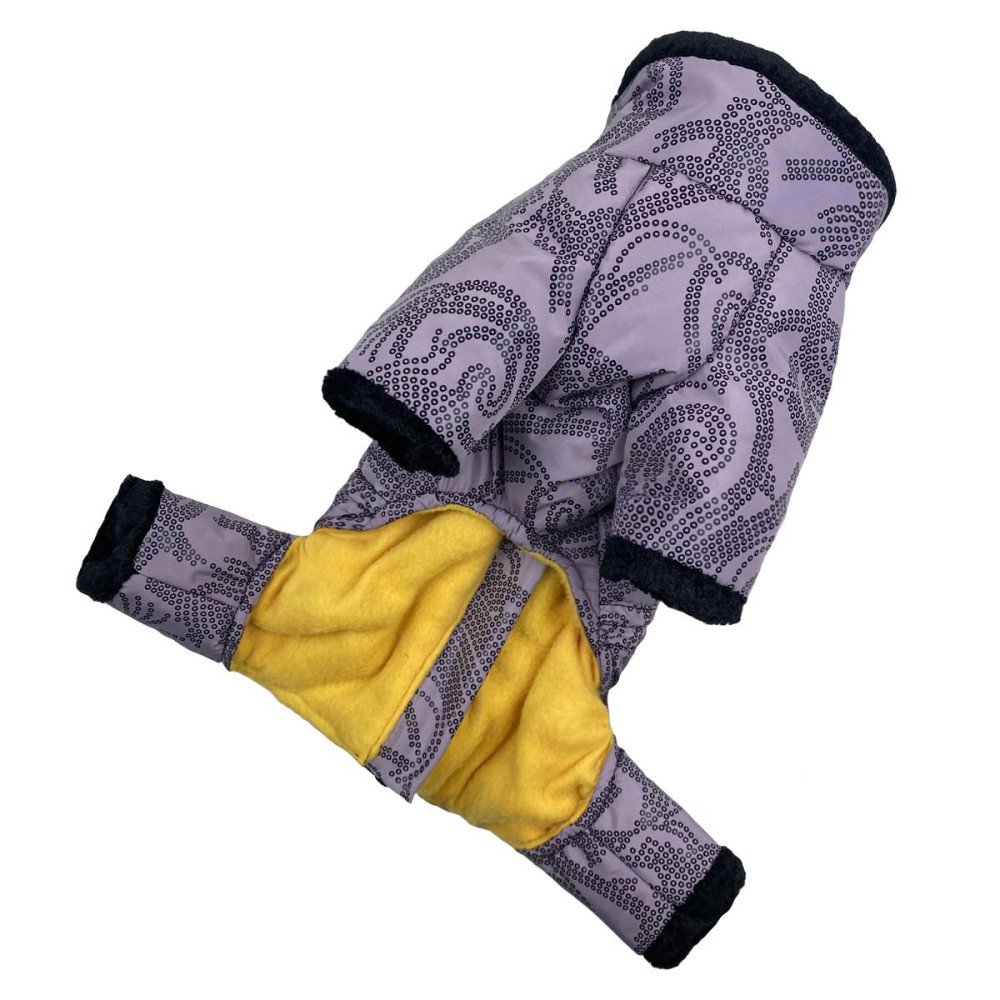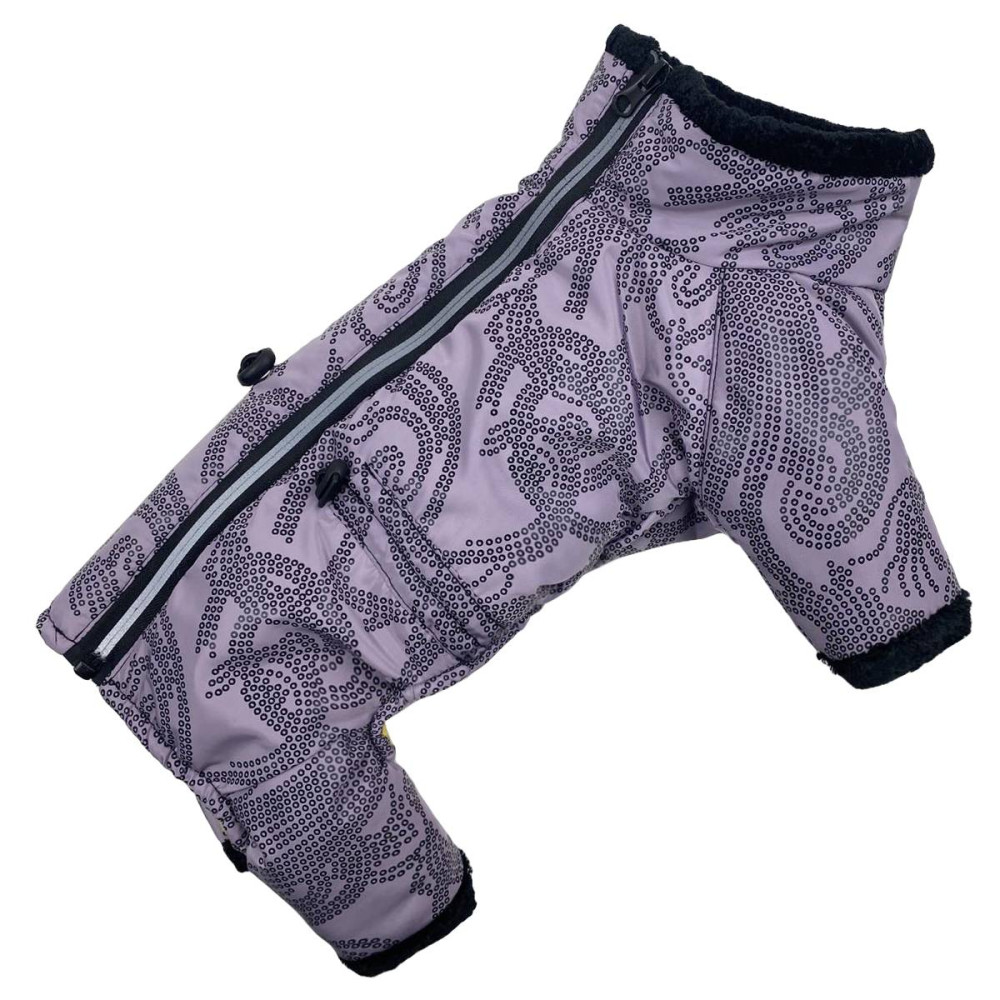 Плащевка нежно сиреневого цвета с абстрактными узорами препятствует намоканию остальных слоев одежды, проникновению влаги к телу собаки.