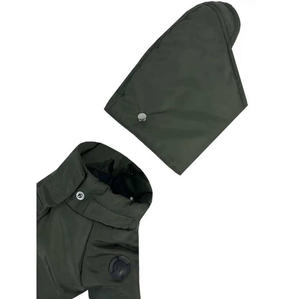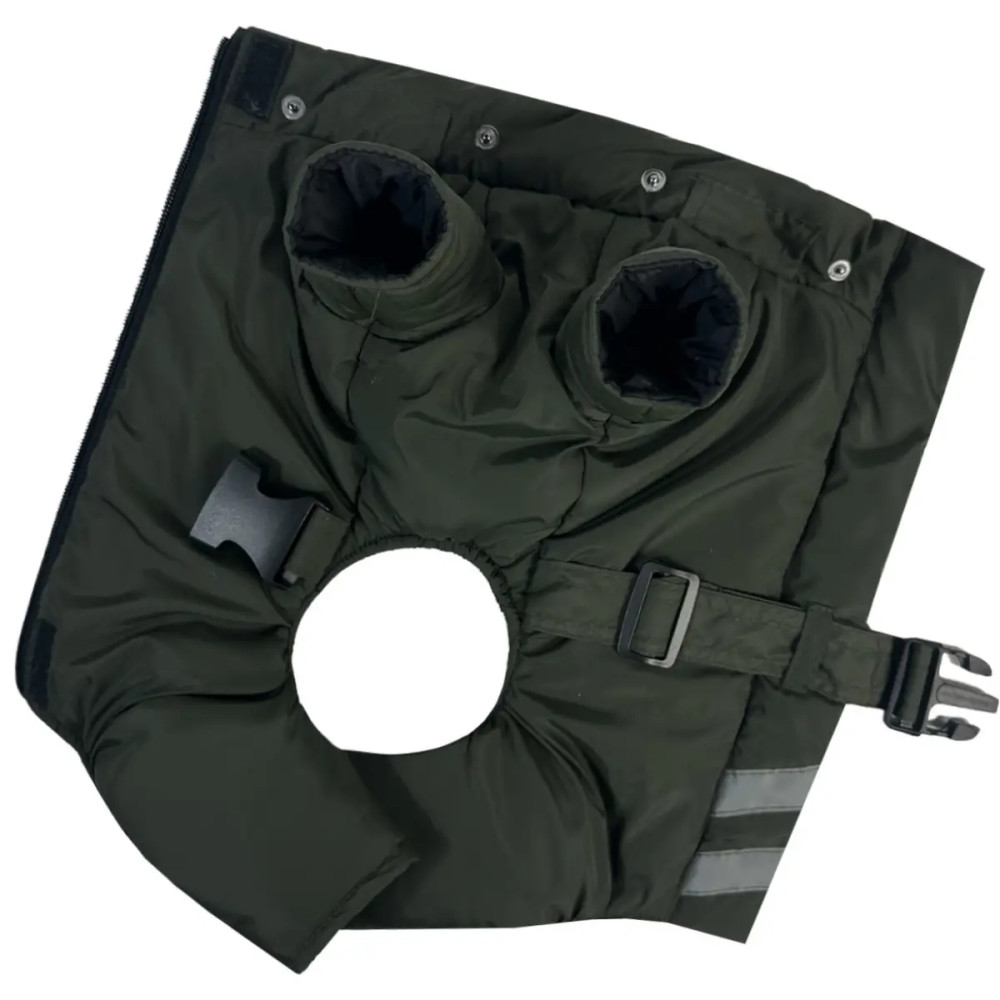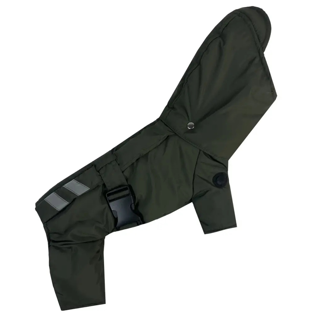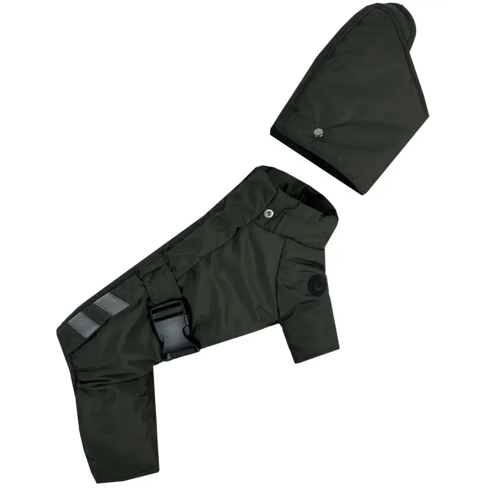 Зимний комбинезон для собак с поясом хаки R-60 – отличное решение для прогулок в холодное время года.