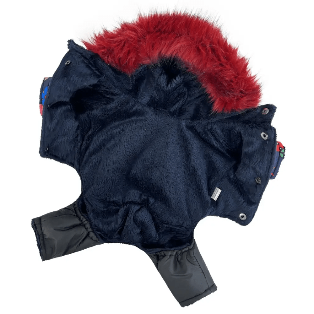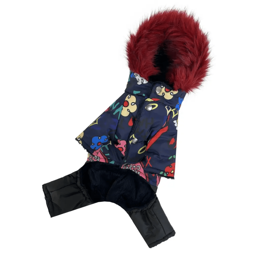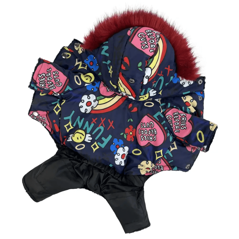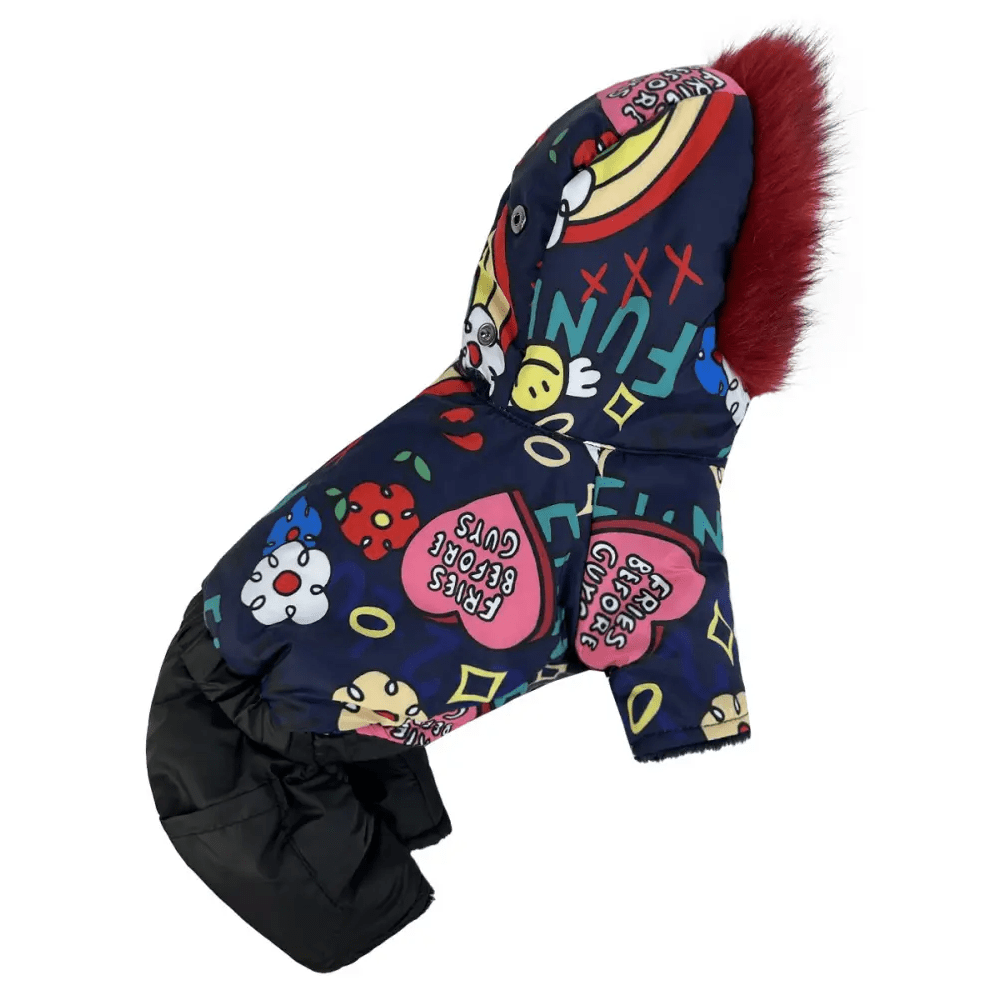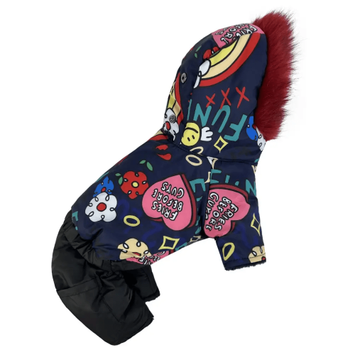 Зимний комбинезон для собак AM-30 с весёлым принтом Funny – это яркое и практичное решение для зимних прогулок. Выполненный из водоотталкивающей плащевки, он надёжно защищает от влаги, сохраняя комфорт вашего питомца в снежную или дождливую погоду. Синтепоновый наполнитель удерживает тепло, а плюшевая подкладка из меха добавляет мягкости и уюта.
