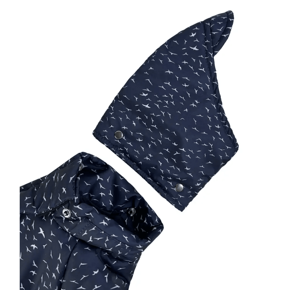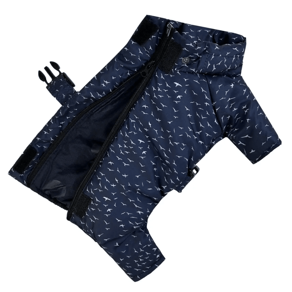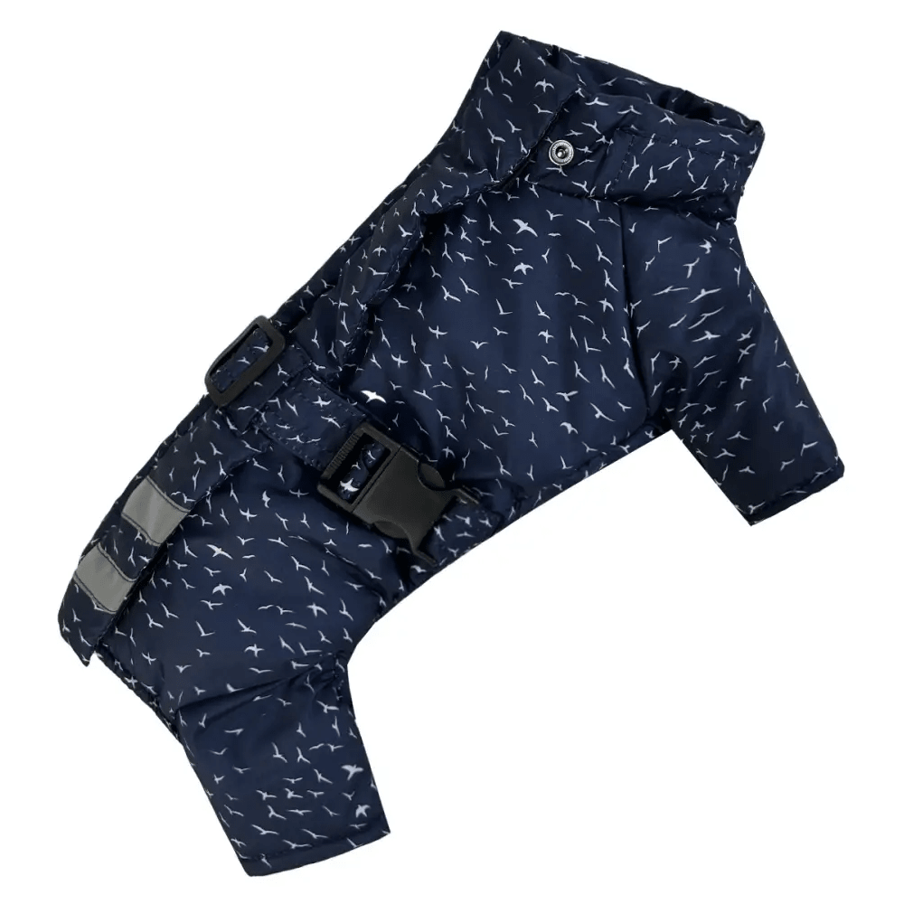 Зимний комбинезон для собак Dogs Bomba R-46 с оригинальным принтом «птички» создан для защиты питомца от холода и сырости при температуре до -10°C. Изделие выполнено из качественной водоотталкивающей плащевки и утеплено слоем синтепона, что гарантирует сохранение тепла. Благодаря продуманному крою с регулируемым поясом, комбинезон плотно прилегает к корпусу, не сковывая движений. Это качественная [зимняя одежда для собак](https://test.4dog.com.ua/ru/odezhda-dlya-sobak/zimnyaya-odezhda-dlya-sobak/), сочетающая практичность и стиль.
