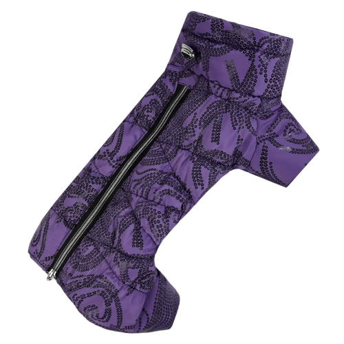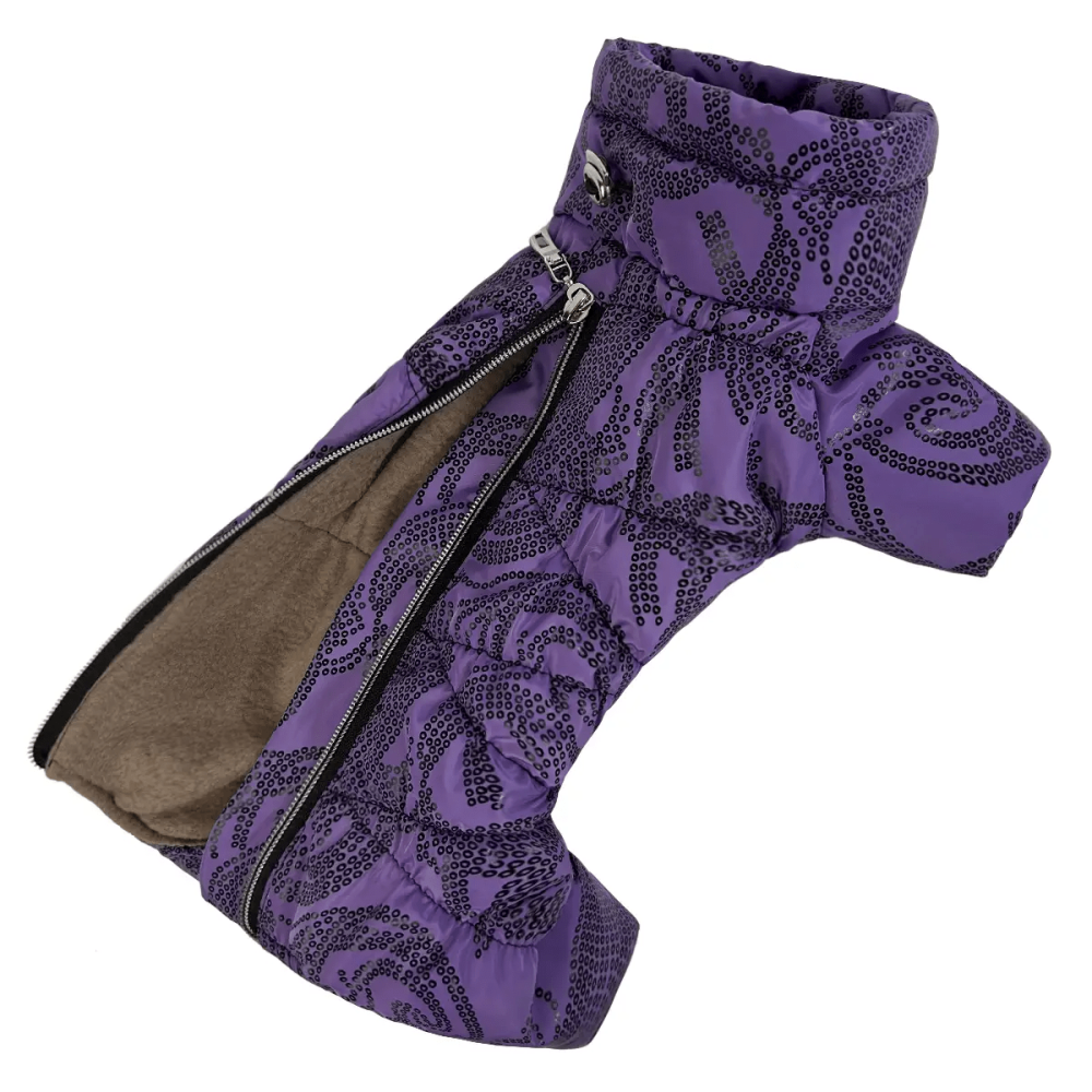 Зимний комбинезон для собак Comfort R-56 в сиреневых узорах – это сочетание практичности, стиля и комфорта для вашего питомца. Изготовленный из водоотталкивающей плащевки, комбинезон надёжно защищает от влаги, обеспечивая сухость даже в сырую погоду. Синтепоновый наполнитель помогает сохранять тепло, а мягкая флисовая подкладка делает комбинезон особенно уютным для собаки.