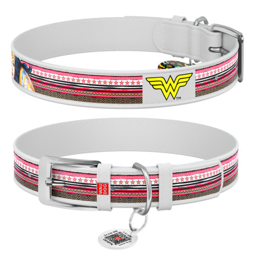 Особенности кожаного ошейника для собак WAUDOG Design белого цвета с рисунком "Чудо-женщина":