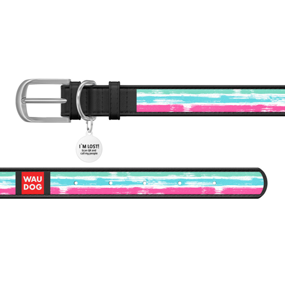 Кожаный чёрный ошейник для собак WAUDOG Design с рисунком "Акварельные полоски" и металлической пряжкой – это идеальный выбор для собак любых пород.
