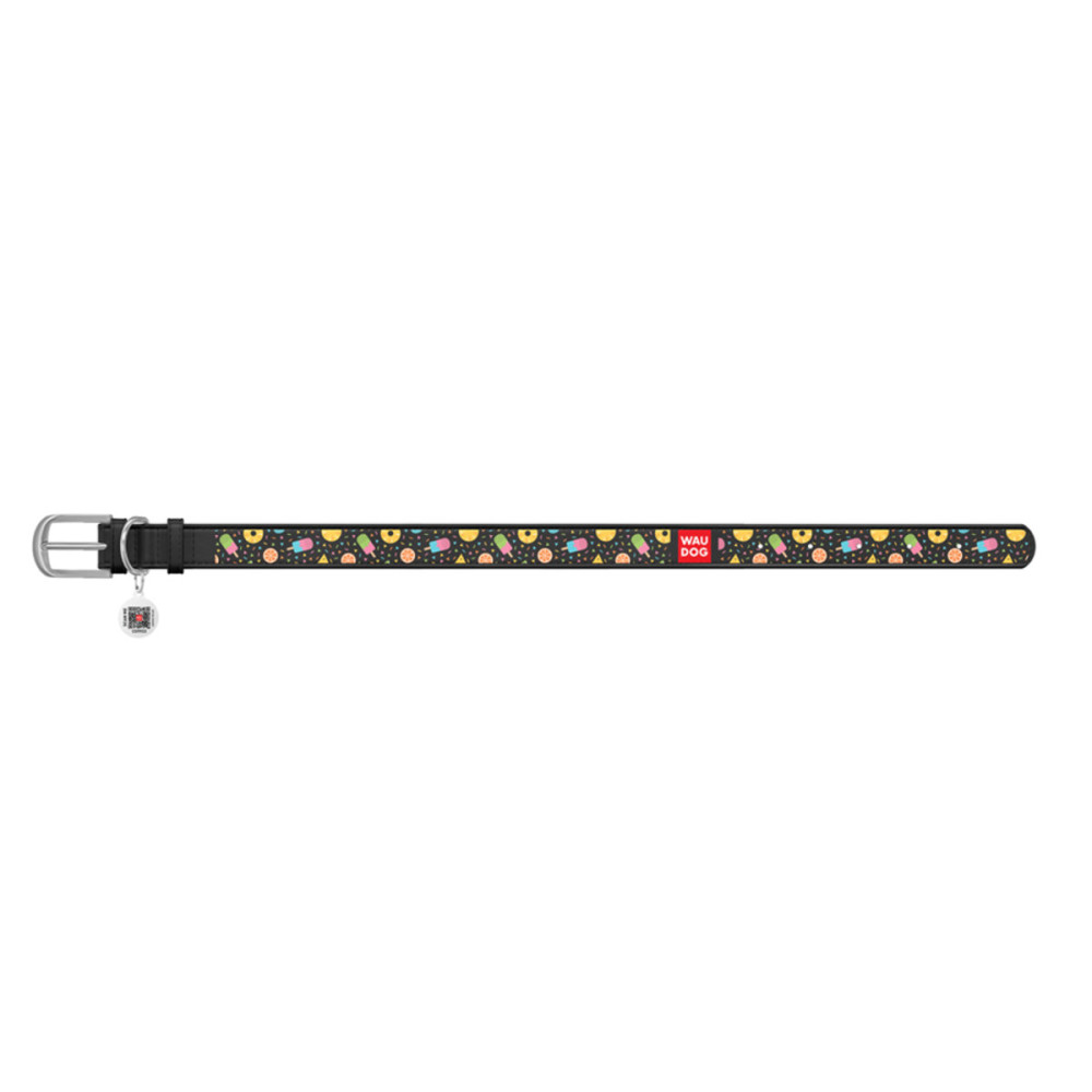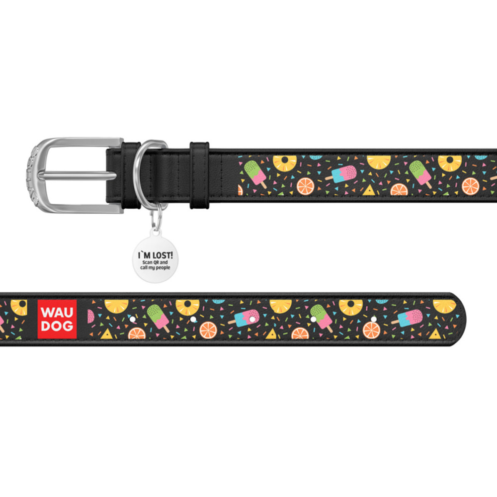 Кожаный чёрный ошейник для собак WAUDOG Design с рисунком "Ананасы и мороженое" и металлической пряжкой – это идеальный выбор для собак любых пород.