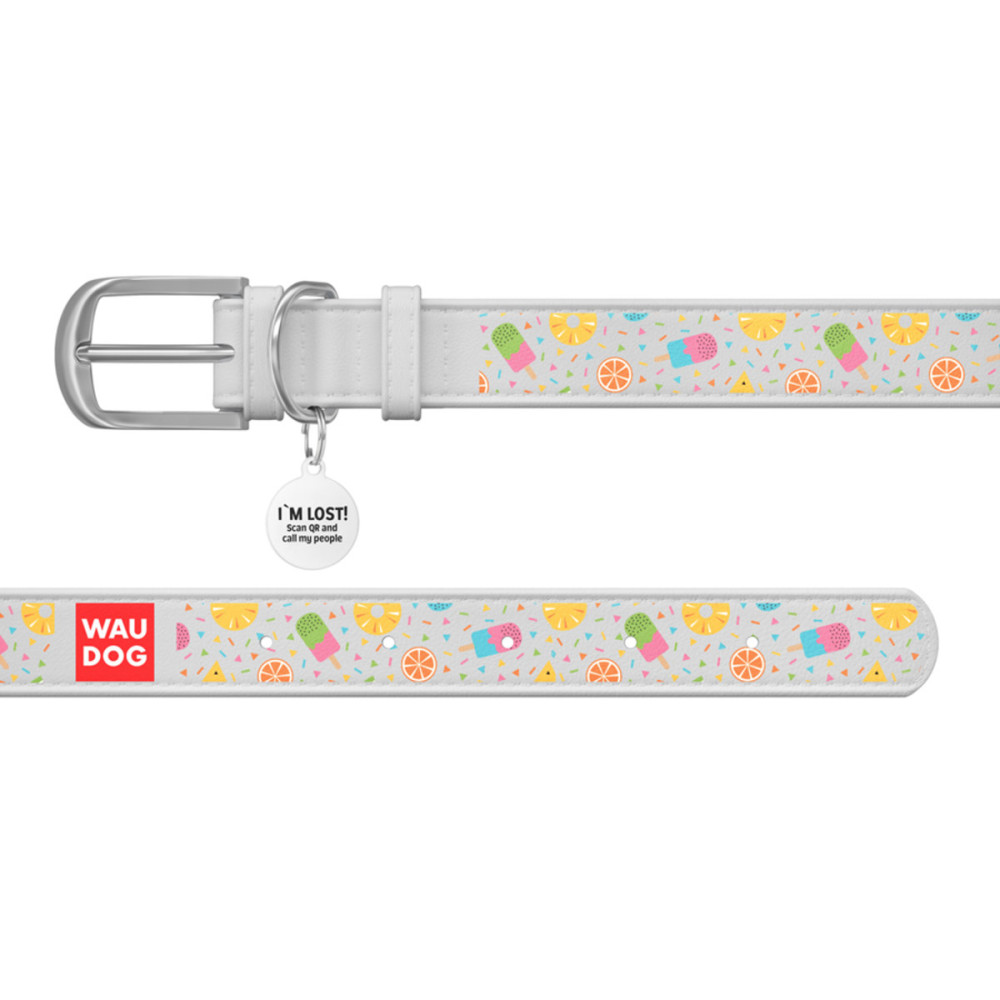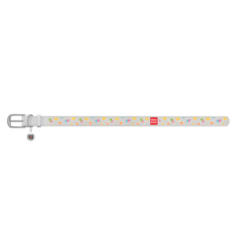 Кожаный белый ошейник для собак WAUDOG Design с рисунком "Ананасы и мороженое" и металлической пряжкой – это идеальный выбор для собак любых пород.