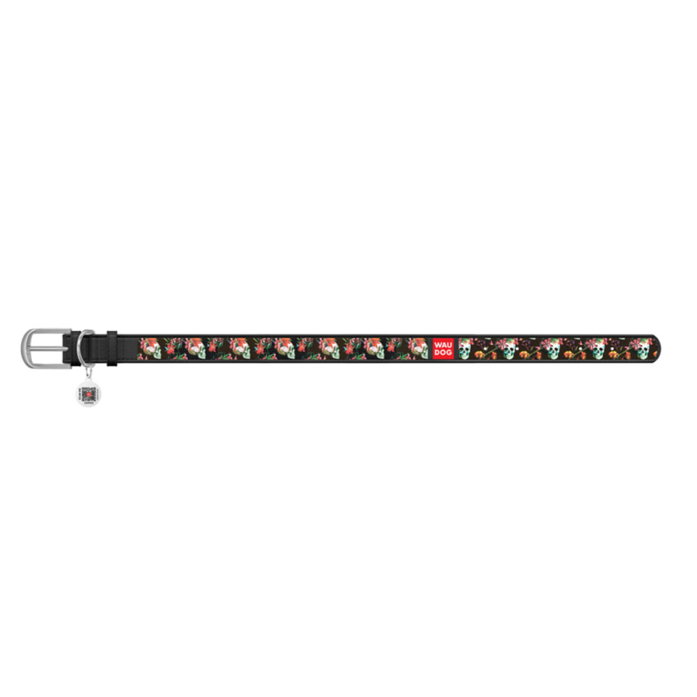 Кожаный чёрный ошейник для собак WAUDOG Design с рисунком "Черепа" и металлической пряжкой – это идеальный выбор для собак любых пород.