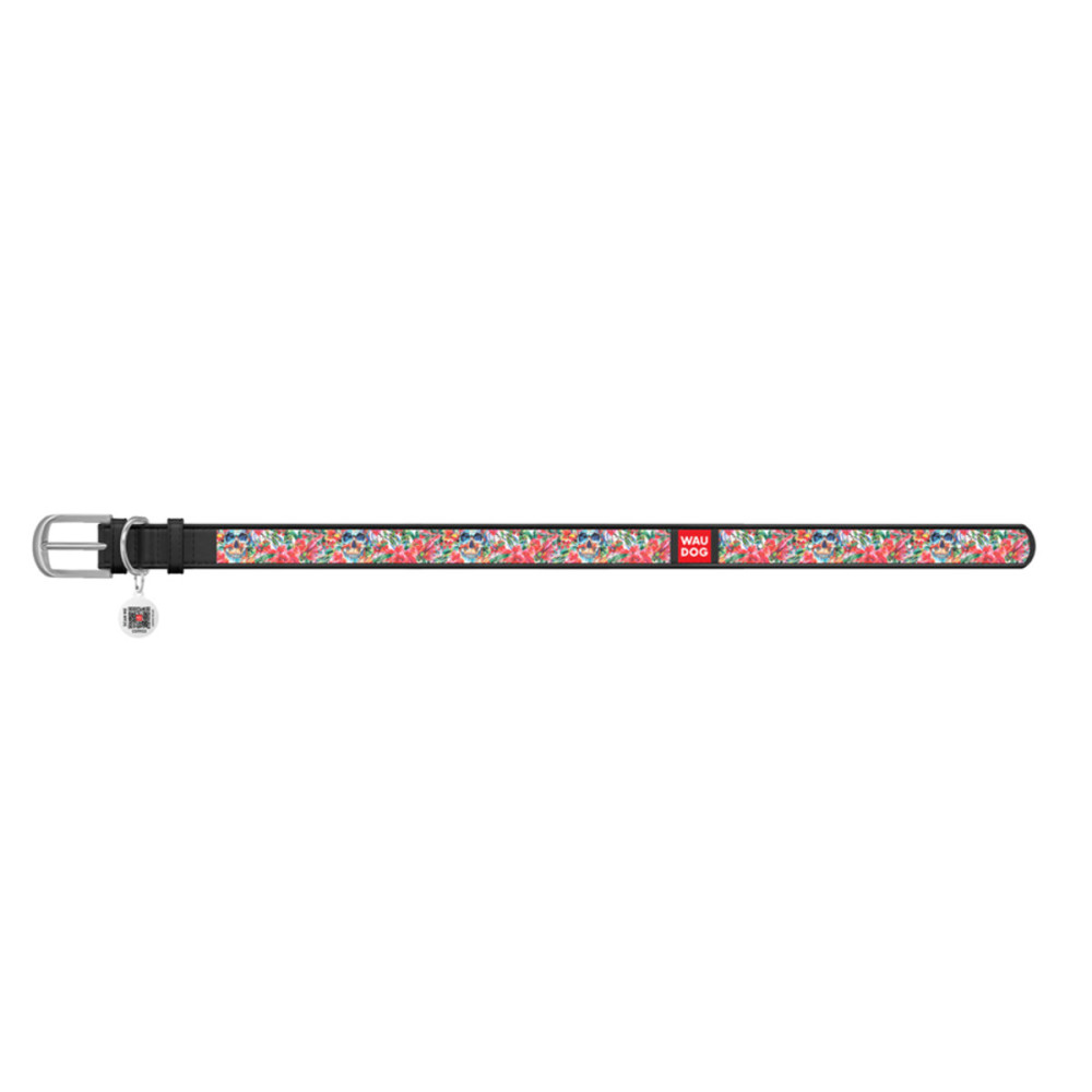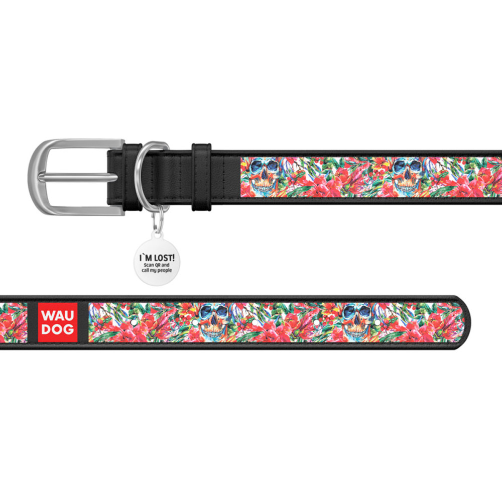 Кожаный чёрный ошейник для собак WAUDOG Design с рисунком "Черепа в цветах" и металлической пряжкой – это идеальный выбор для собак любых пород.