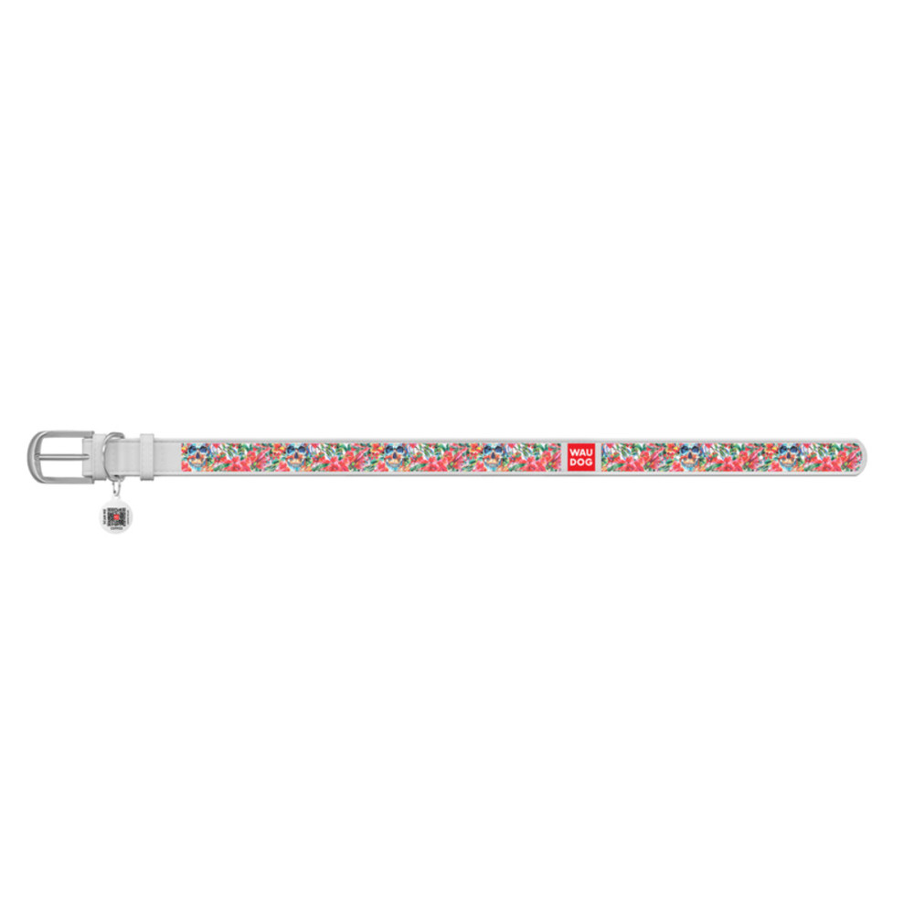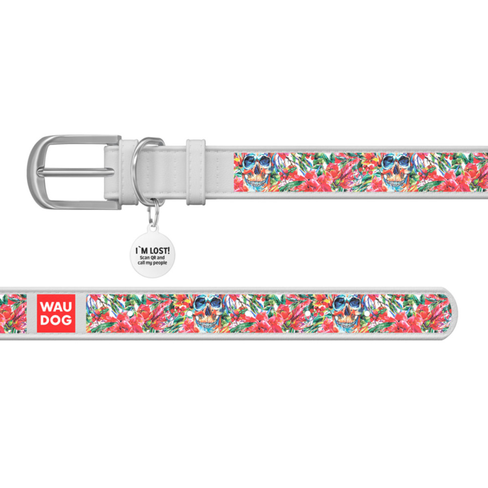 Кожаный белый ошейник для собак WAUDOG Design с рисунком "Черепа в цветах" и металлической пряжкой – это идеальный выбор для собак любых пород.