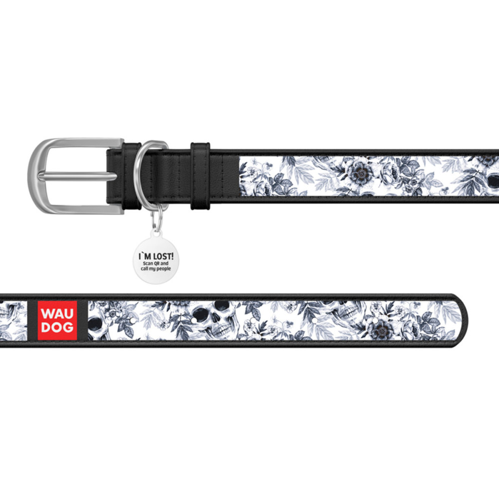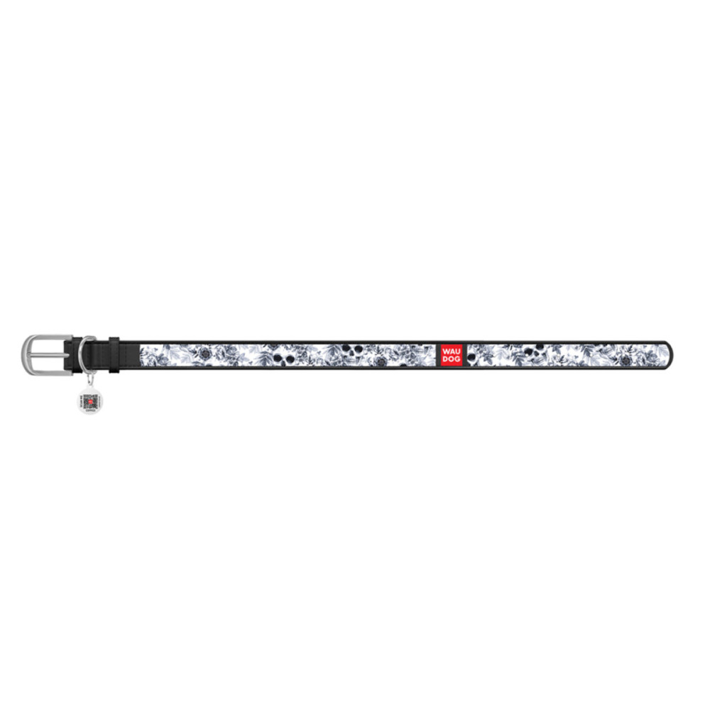Кожаный ошейник для собак WAUDOG Design с рисунком "Черно-белые черепа" и металлической пряжкой – это идеальный выбор для собак любых пород.