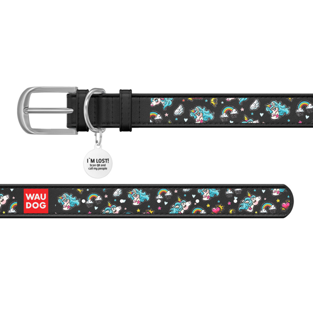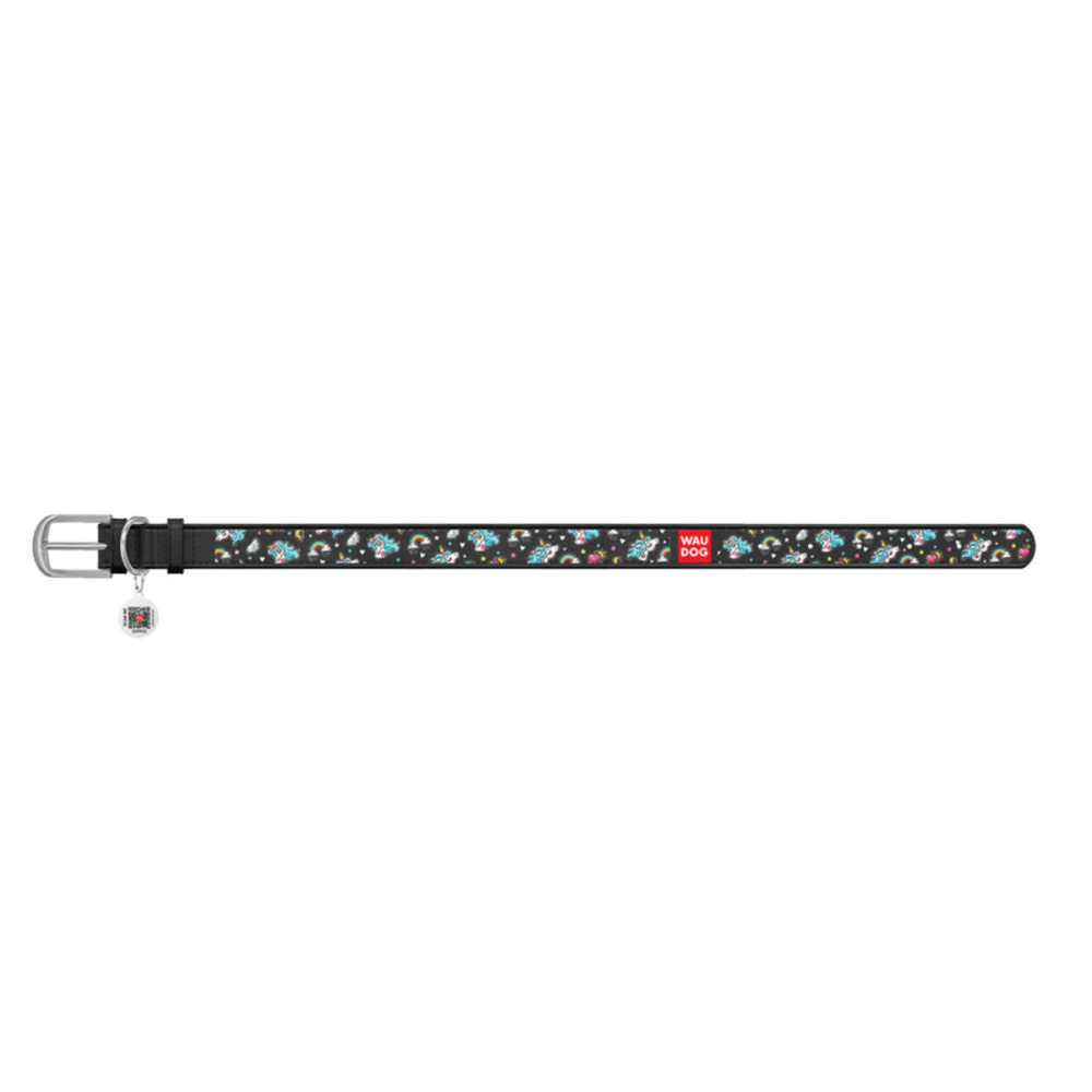 Кожаный чёрный ошейник для собак WAUDOG Design с рисунком "Единороги" и металлической пряжкой – это идеальный выбор для собак любых пород.