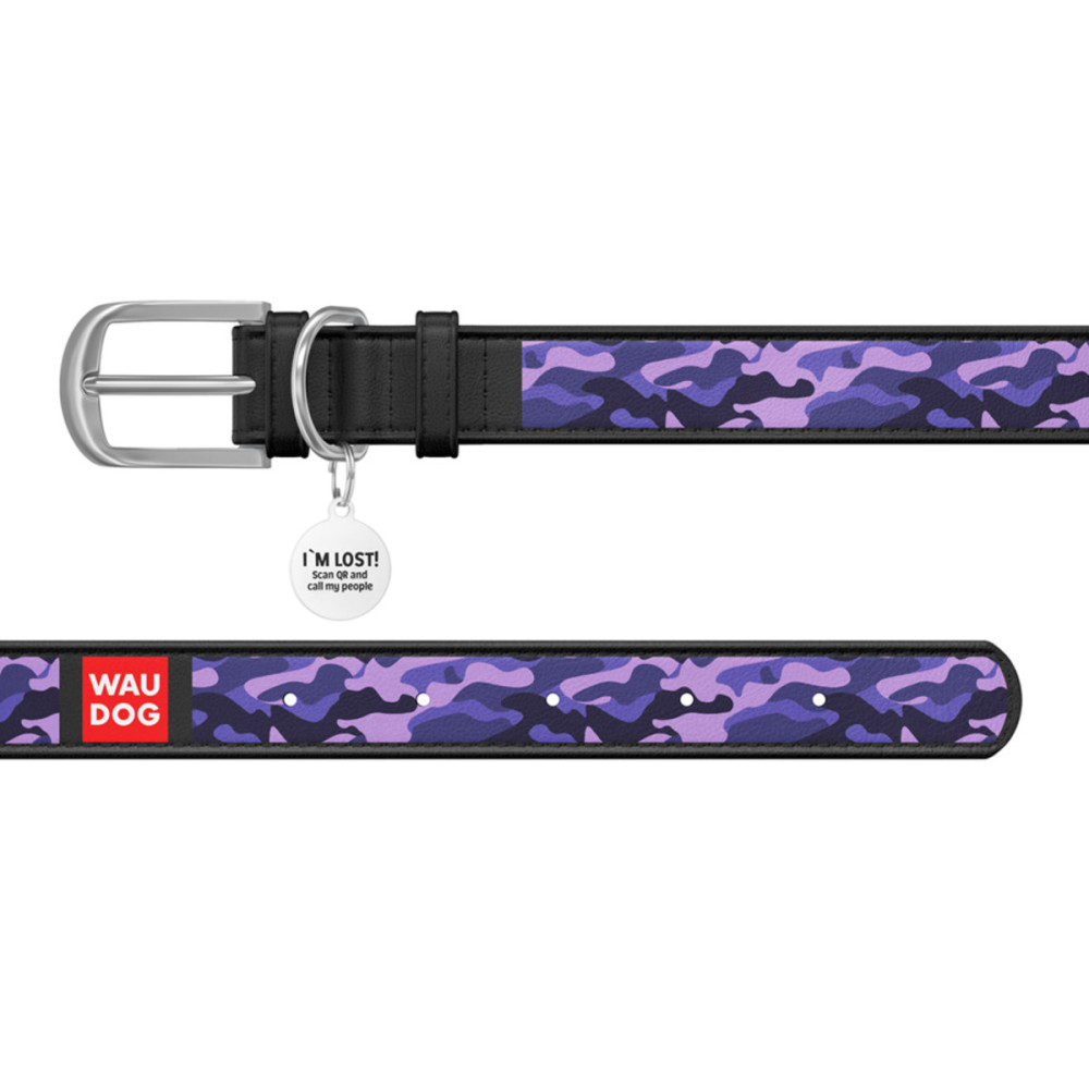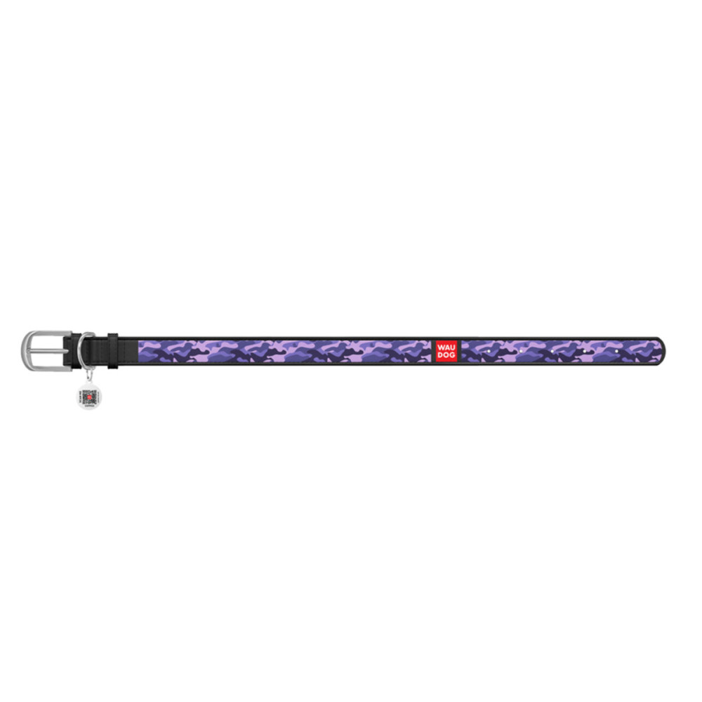 Кожаный чёрный ошейник для собак WAUDOG Design с рисунком "Фиолетовый камо" и металлической пряжкой – это идеальный выбор для собак любых пород.