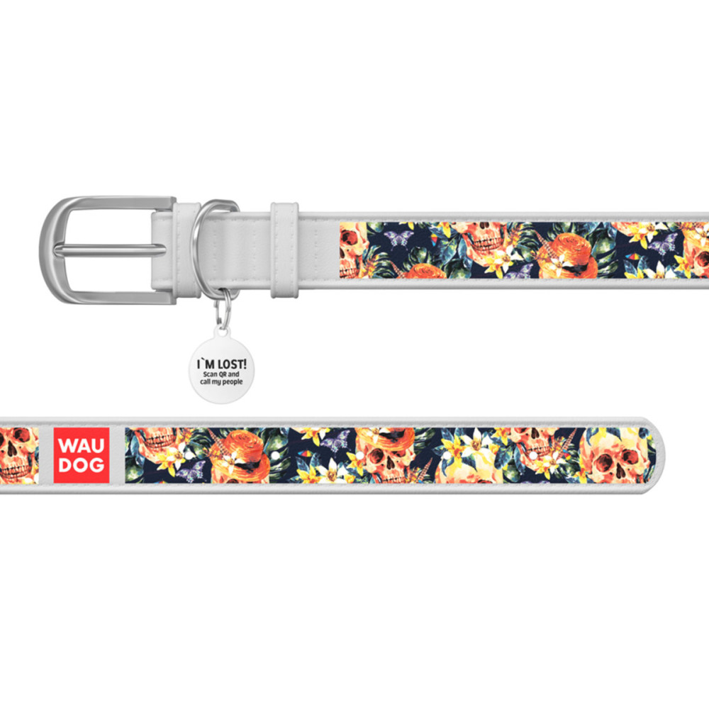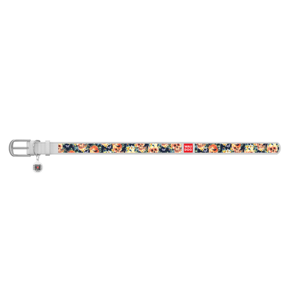 Кожаный белый ошейник для собак WAUDOG Design с рисунком "Гламурные черепа" и металлической пряжкой – это идеальный выбор для собак любых пород.