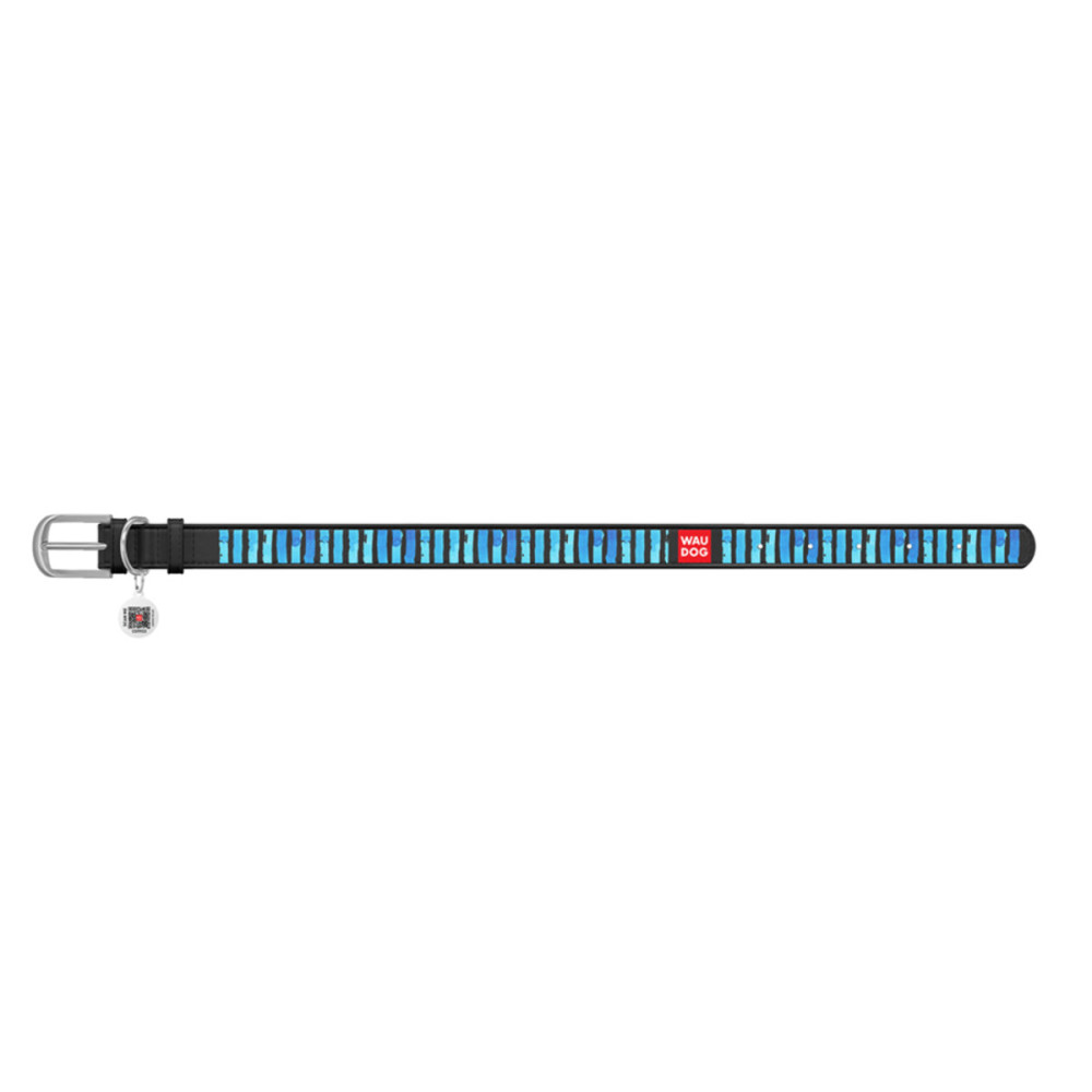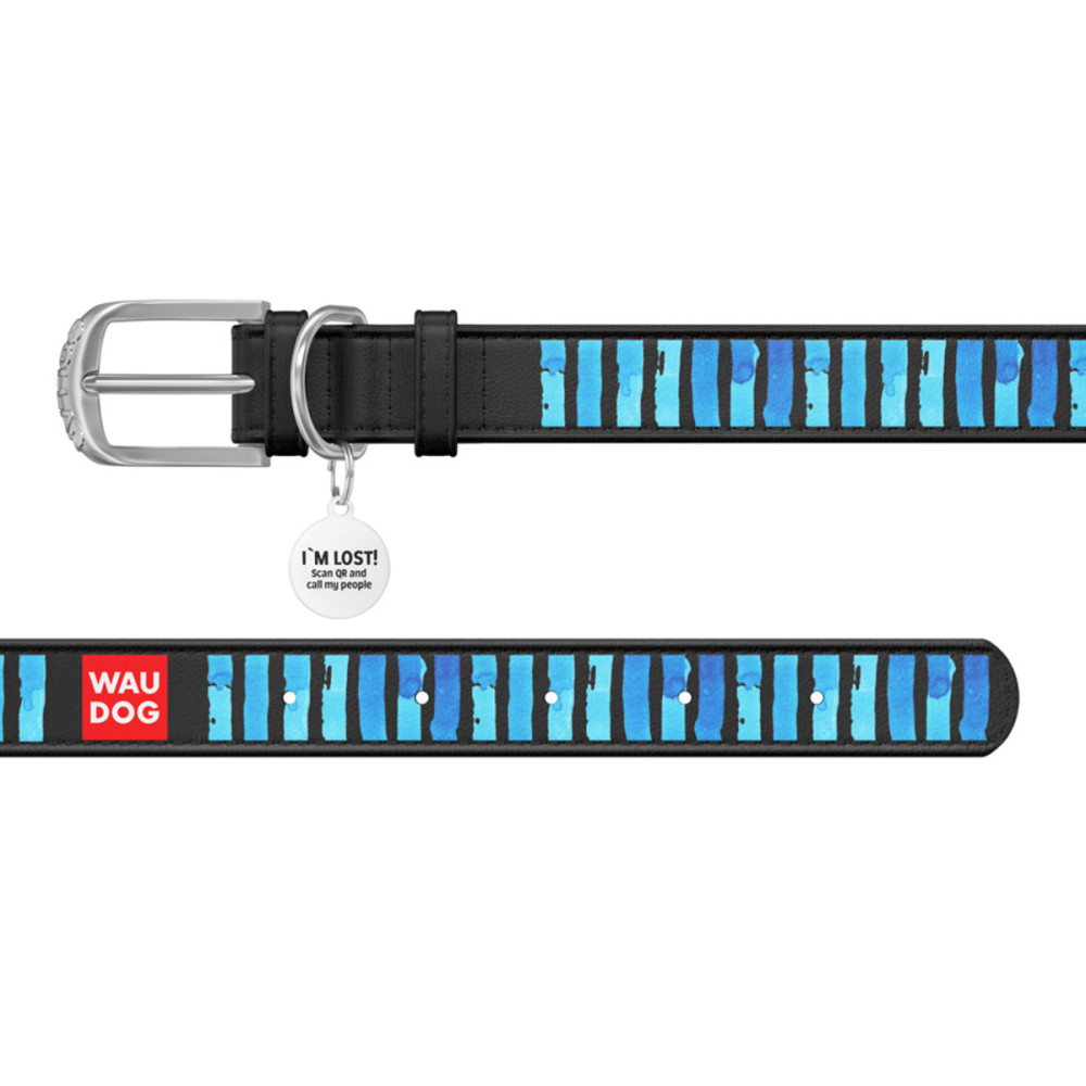 Кожаный чёрный ошейник для собак WAUDOG Design с рисунком "Голубые полоски" и металлической пряжкой – это идеальный выбор для собак любых пород.