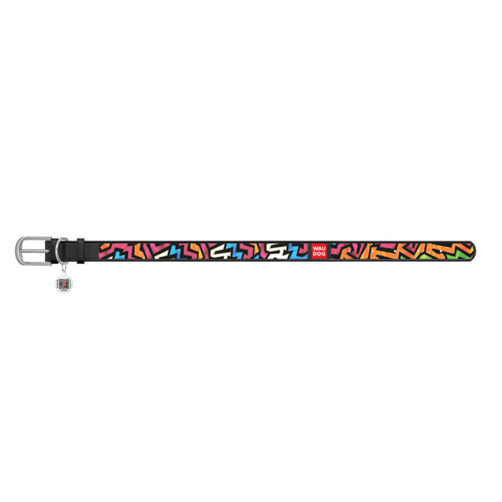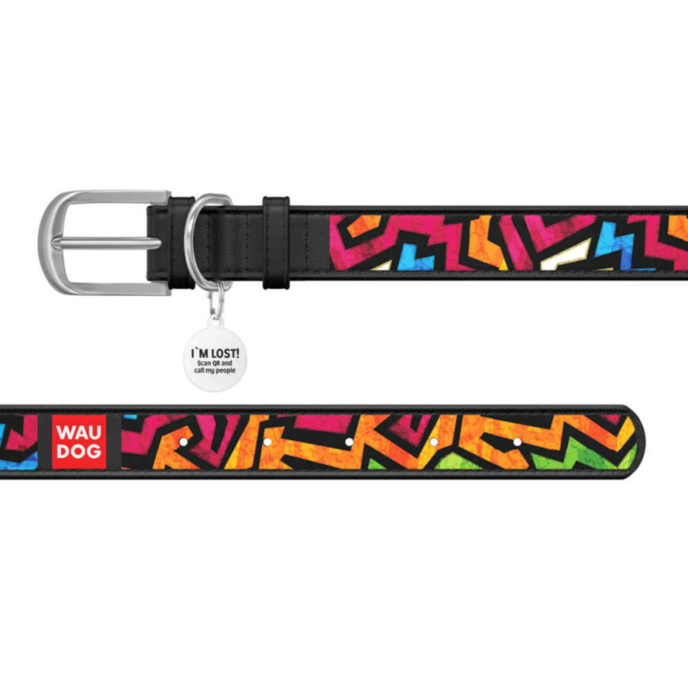 Кожаный чёрный ошейник для собак WAUDOG Design с рисунком "Граффити" и металлической пряжкой – это идеальный выбор для собак любых пород.