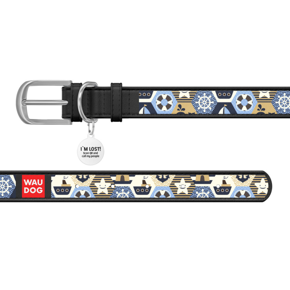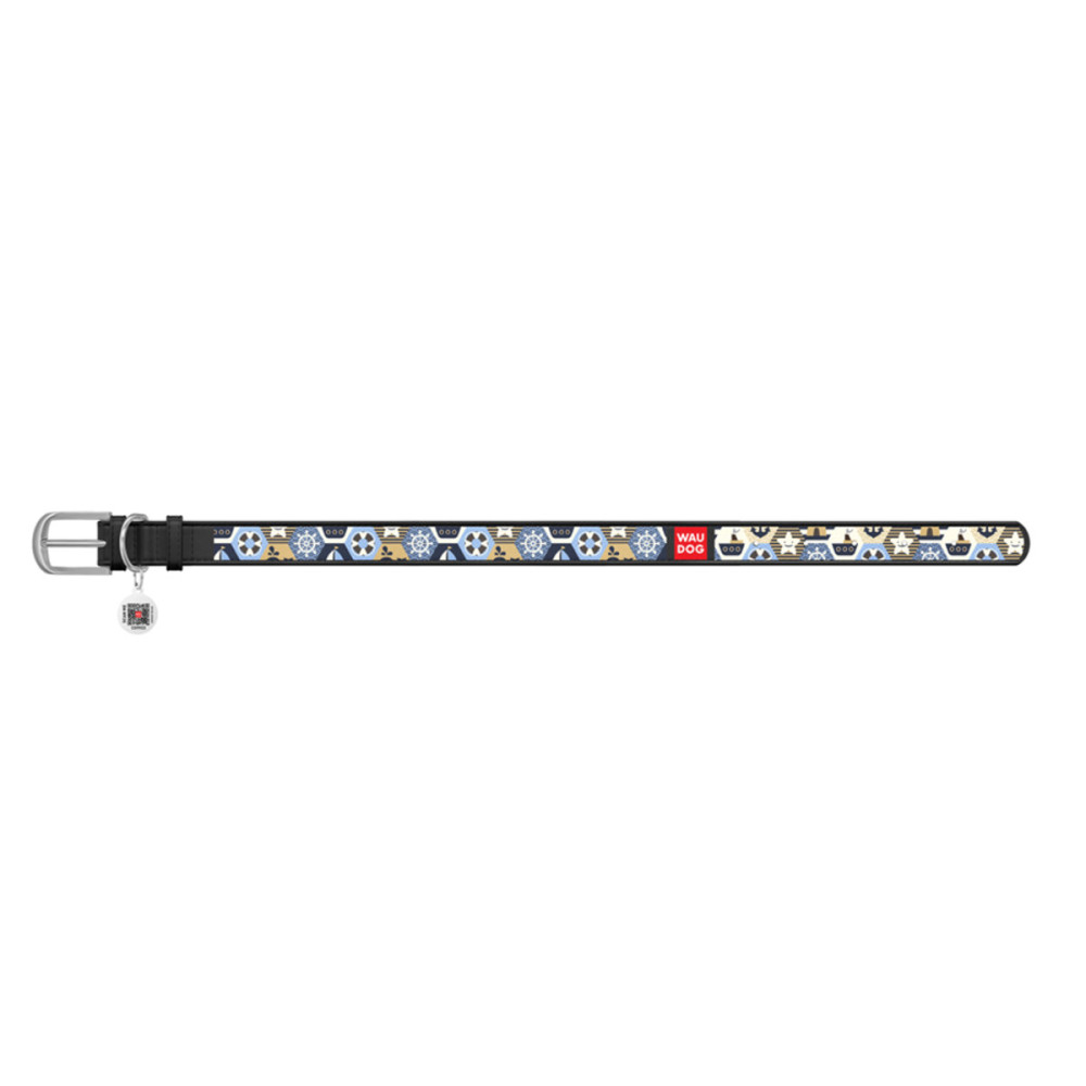 Кожаный чёрный ошейник для собак WAUDOG Design с рисунком "Капитан" и металлической пряжкой – это идеальный выбор для собак любых пород.