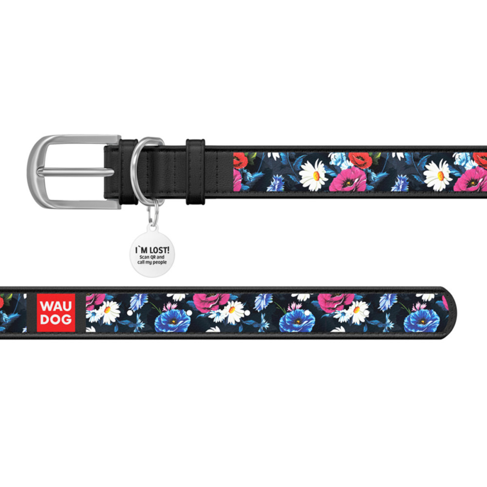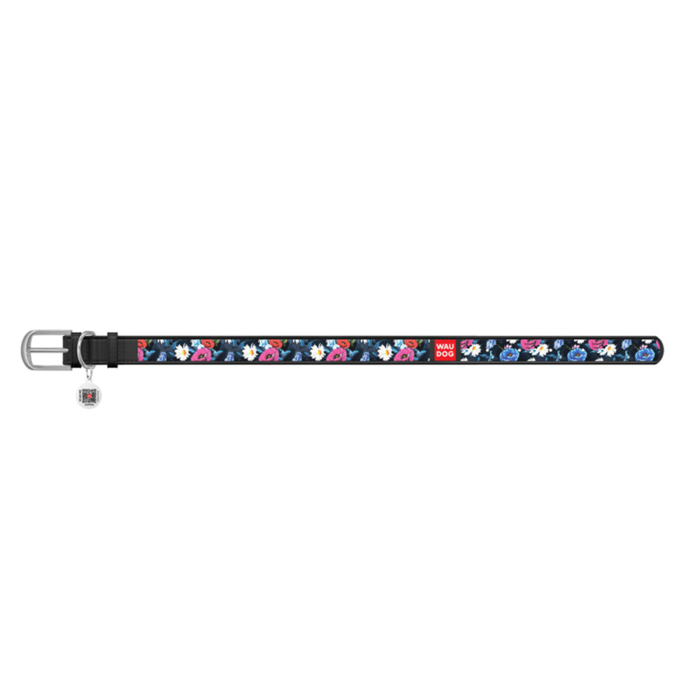 Кожаный чёрный ошейник для собак WAUDOG Design с рисунком "Летний луг" и металлической пряжкой – это идеальный выбор для собак любых пород.