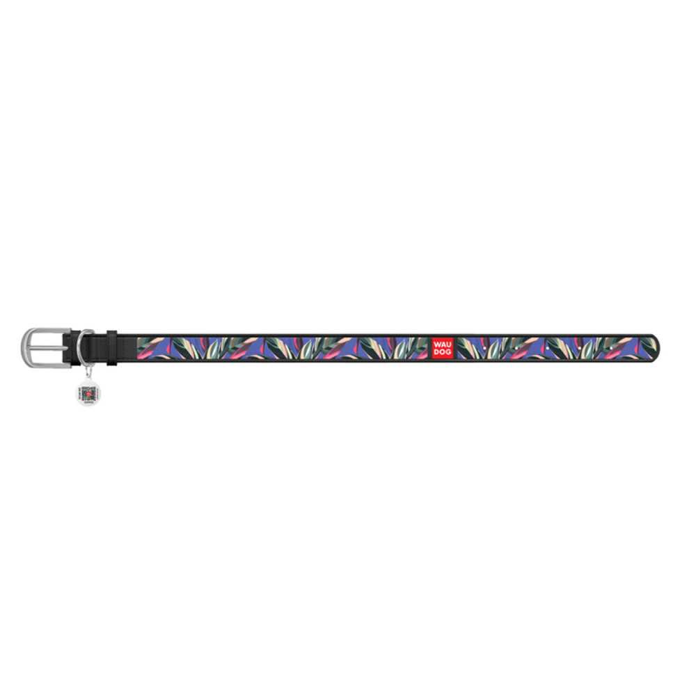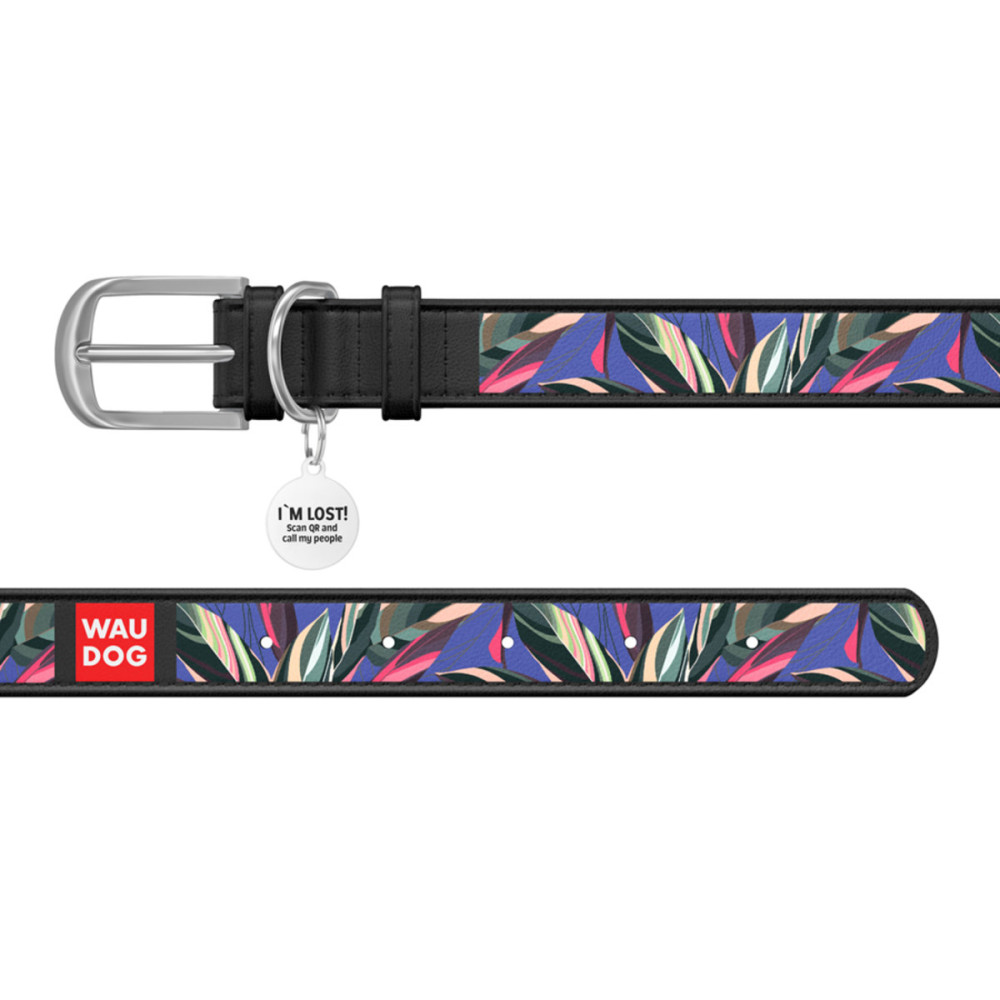 Кожаный чёрный ошейник для собак WAUDOG Design с рисунком "Листья" и металлической пряжкой – это идеальный выбор для собак любых пород.