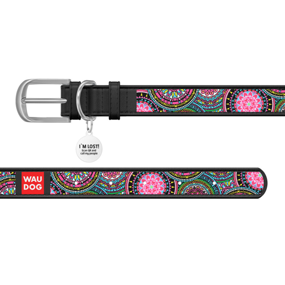 Кожаный чёрный ошейник для собак WAUDOG Design с рисунком "Мандалы" и металлической пряжкой – это идеальный выбор для собак любых пород.