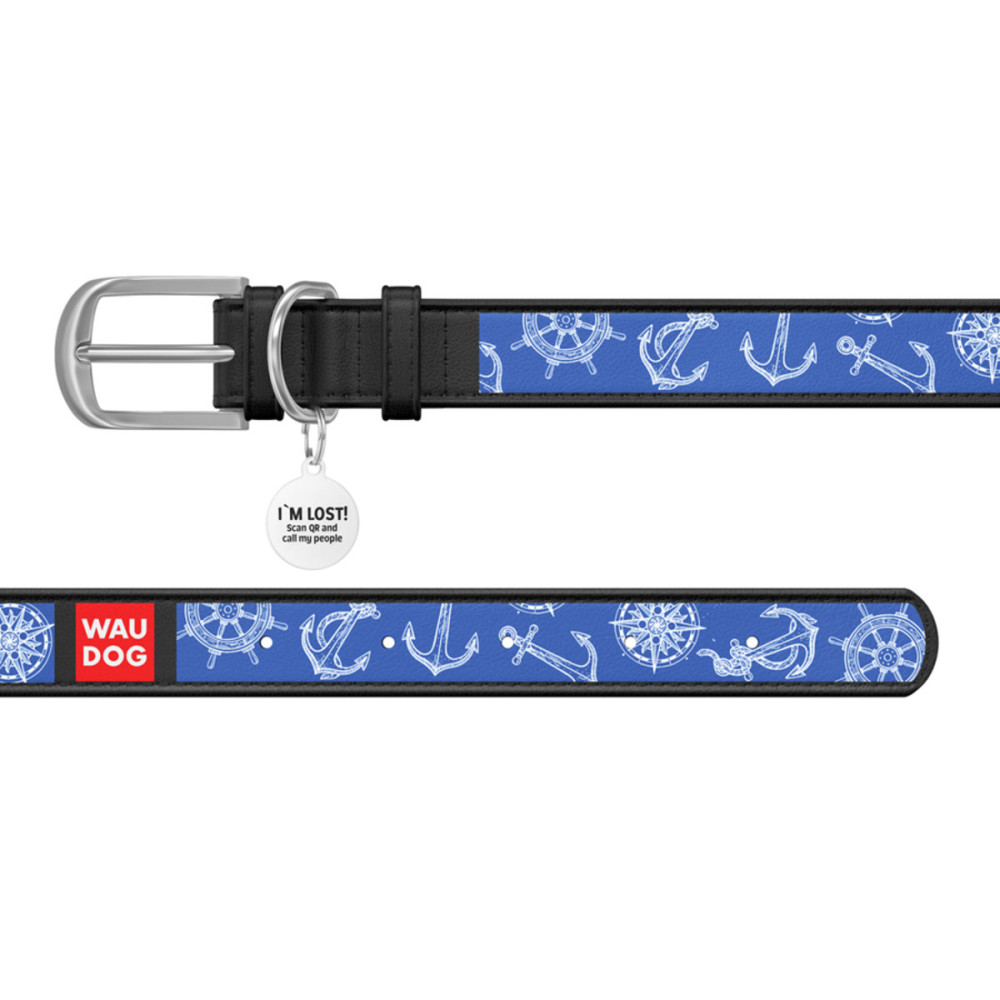 Кожаный чёрный ошейник для собак WAUDOG Design с рисунком "Морская фантазия" и металлической пряжкой – это идеальный выбор для собак любых пород.